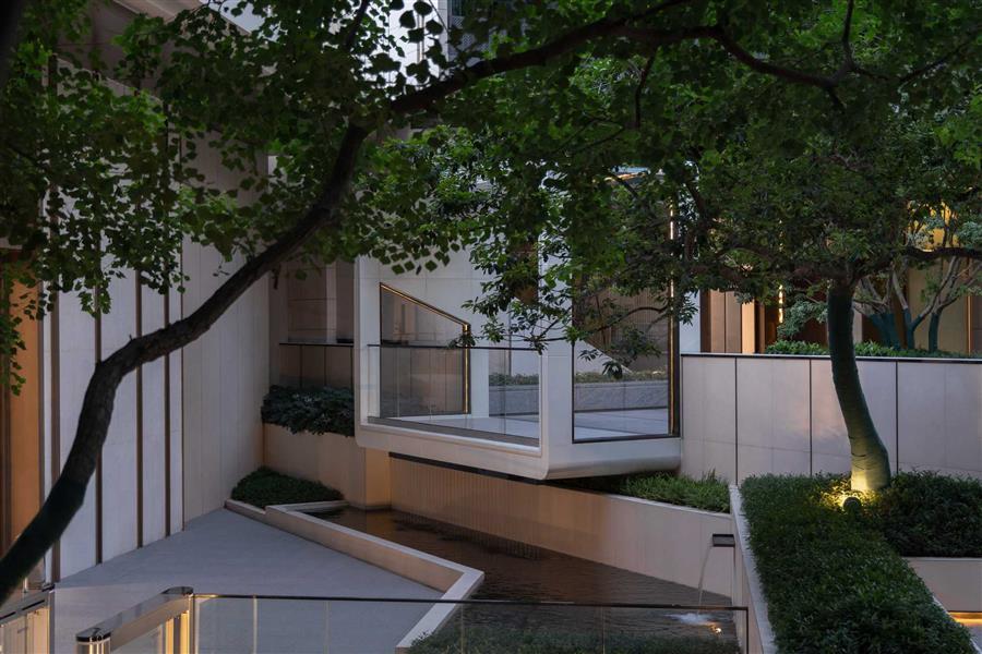 穿過涼風(fēng)習(xí)習(xí)的樹陣,眼前乍現(xiàn)的主入口空間極具儀式感,信步拾級(jí)而上,涌泉相迎,綠植旁逸。高差景觀的變化,搭配造型優(yōu)美的喬木,以及修剪整齊的綠籬,整體給人豐富的層次感。