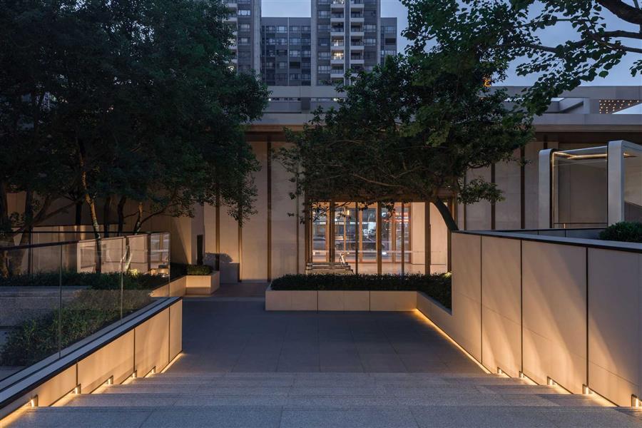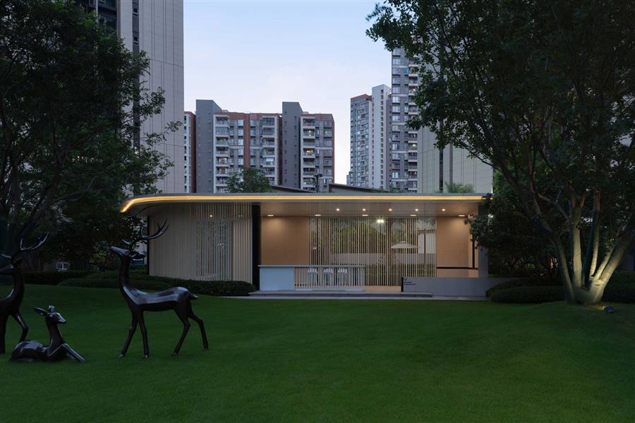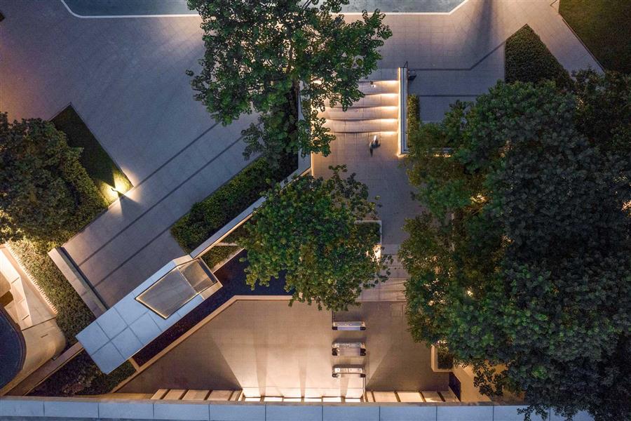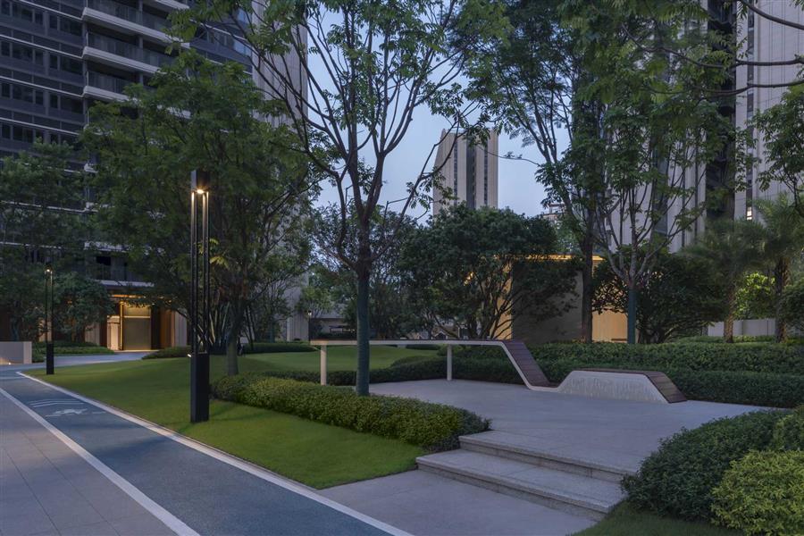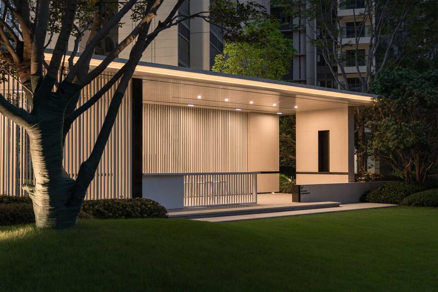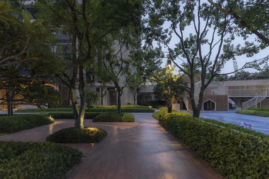 青蔥整齊的草丘鋪成蜿蜒小徑,指引人們歸家的路。暖橘色調(diào)的燈光徐徐散落在草丘上,讓黃昏后的歸家顯得寧靜而溫馨。