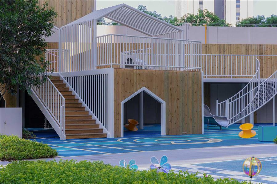 主題泡池、汀步、水滑梯、趣味座椅、水簾等的增設(shè),賦予泳池趣味性,滿足兒童戲水玩耍的需求。休閑平臺(tái)、熱身區(qū)等不同功能性的區(qū)域劃分,便利了家庭關(guān)照及戶外活動(dòng)。