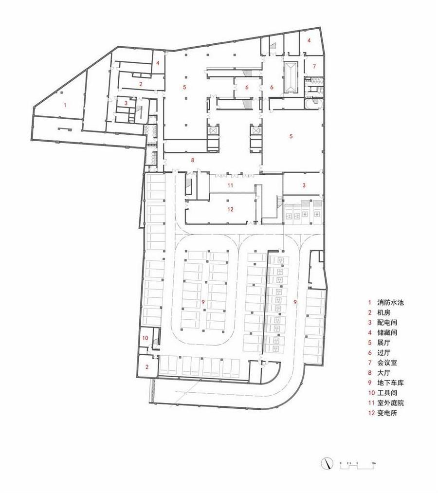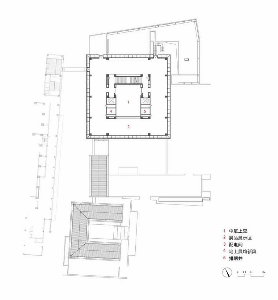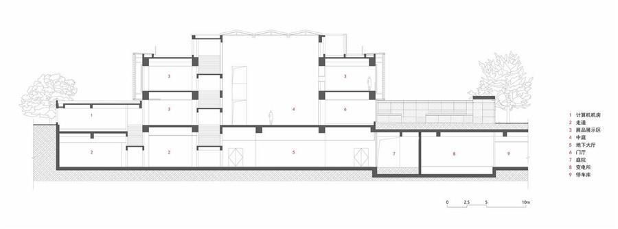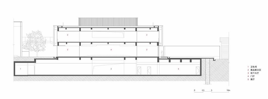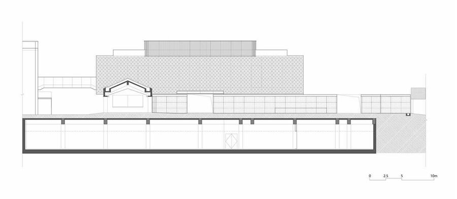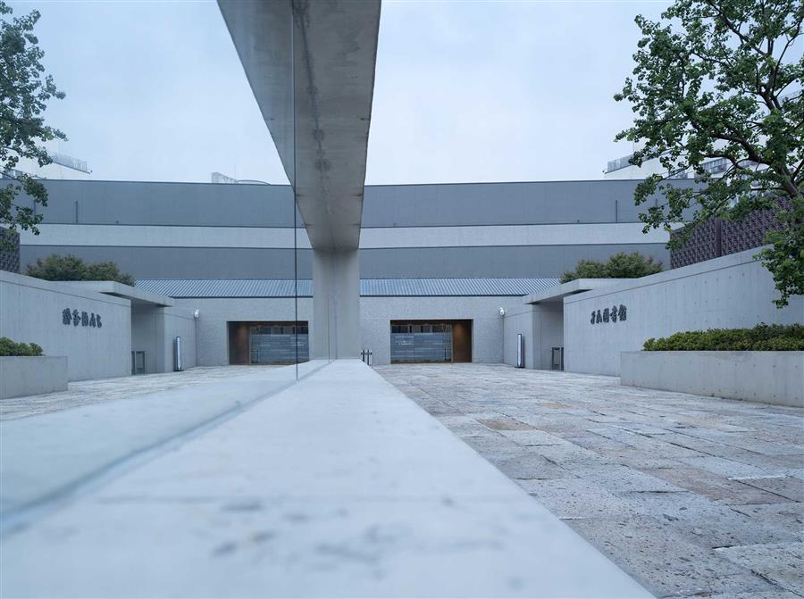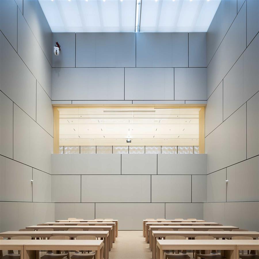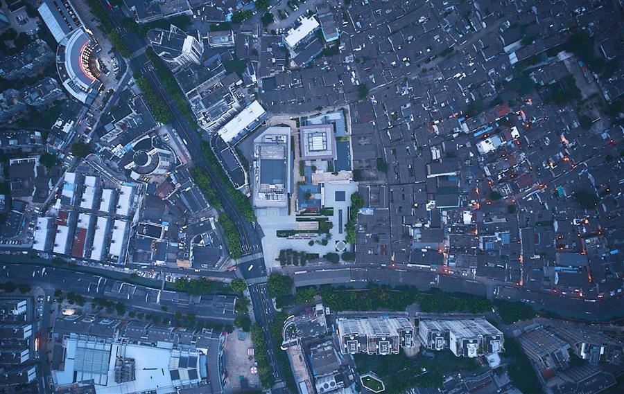 新建的孑民圖書館,由于限高控制,通過層高控制和合理分配,分別在地下設(shè)置了蔡元培生平事跡展,地上安排了兩層圖書館及中央通高的元培講堂,以及特別設(shè)立的屋頂觀光休閑平臺,從平臺眺望四周,是書圣故里的故里群像和遠處城市廣場的大善塔。