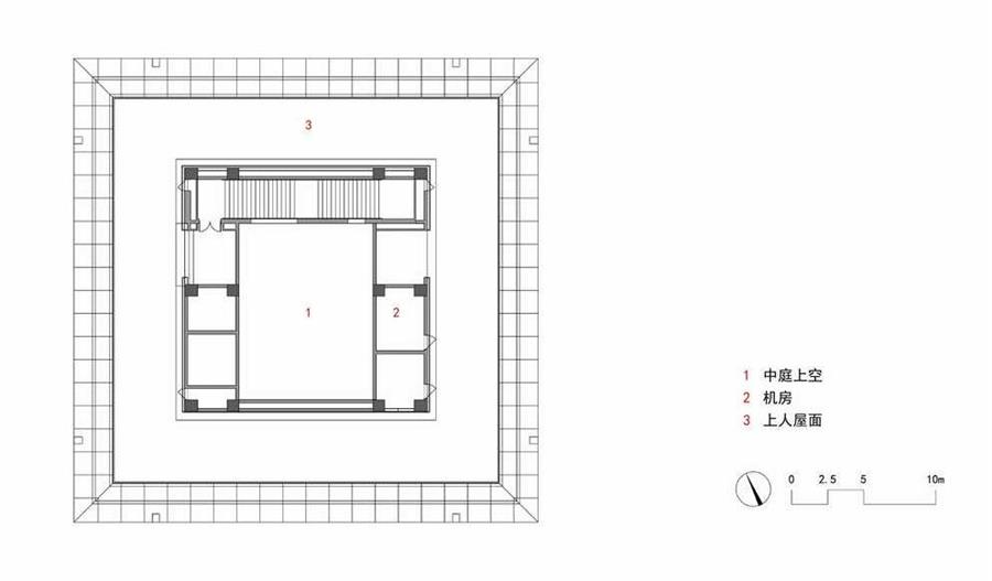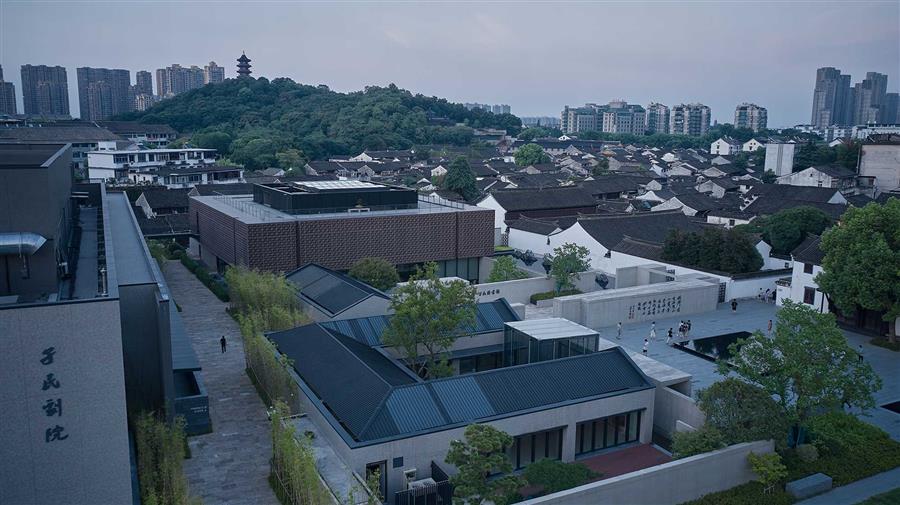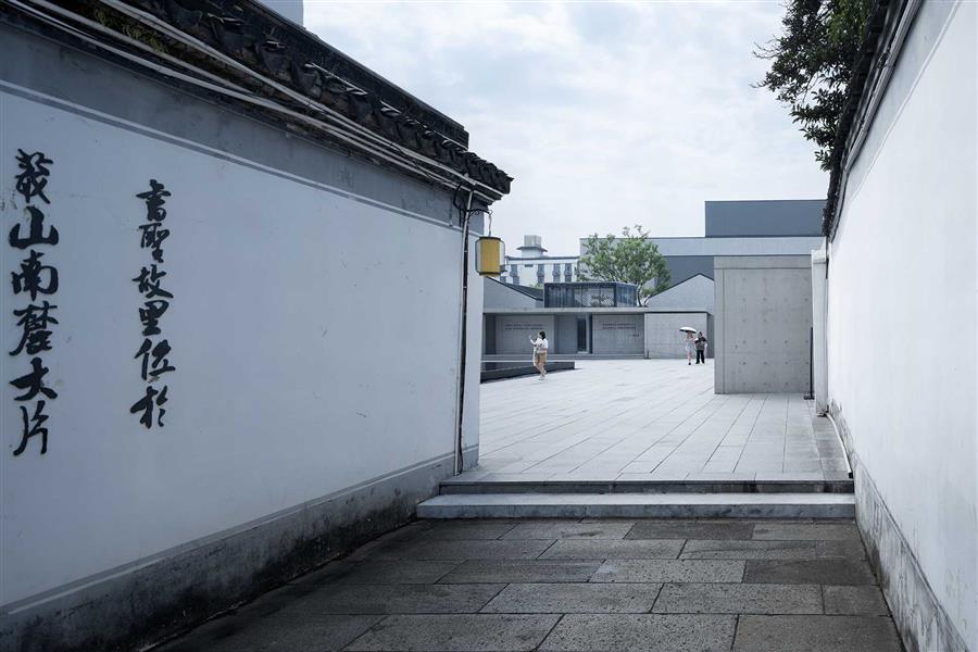 水院的南側(cè)有一觀景開口,遠處是千年蕺山和文筆塔,開口處設(shè)有一平臺,左側(cè)是演繹了暗紅色漏窗卻極具現(xiàn)代的圖書館盒子,右側(cè)是故居經(jīng)典的山墻輪廓線。近處的淺水面,將所有的一切映入其中。