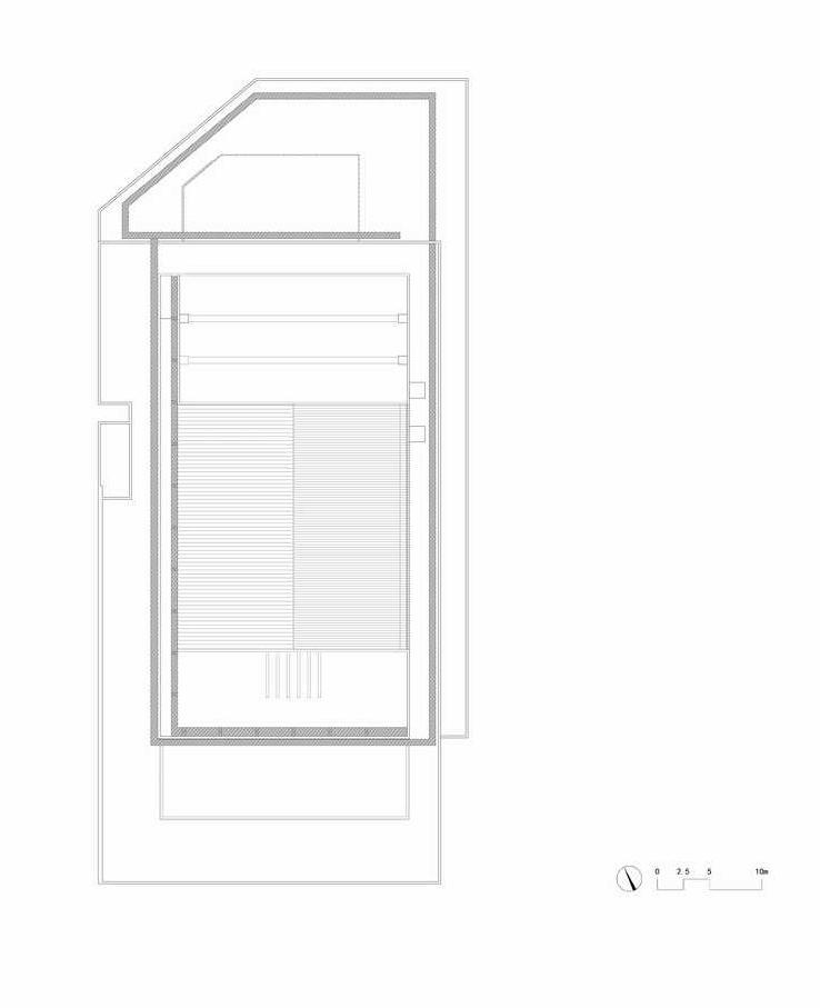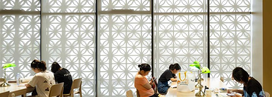 圖書館西側(cè)與孑民劇院以局弄相隔,東側(cè)與故居以一水院相鄰,彼此對望。水院的一側(cè)是被完整呈現(xiàn)的優(yōu)美的蔡元培故居山墻輪廓線,代表了書圣故里明清臺門風(fēng)采的傳統(tǒng)意蘊;另一側(cè)則是演繹了肌理與映射的圖書館現(xiàn)代盒子,暗紅色的UHPC板,圖樣采擷自故里的漏窗,色彩是傳統(tǒng)的木紅色。兩者通過新建建筑一層外墻通長的高反射單向鏡面玻璃,淋漓盡致地講述了新與舊、過去與現(xiàn)在的對話與碰撞。