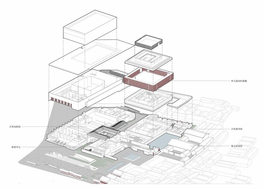 書圣故里具有古城典型的文脈和風(fēng)貌特征,隨著時間的推進和流逝,累積演化在了城市的肌理和建筑的形式表現(xiàn)中,既有著良性的鏈接又有消極的斷裂。我們從動態(tài)發(fā)展的歷史語境中,辯證對待建址內(nèi)的“孑民電影院”,“局弄”,“紹興市第五醫(yī)院”,“蔡元培廣場”,以及緊鄰的“蔡元培故居”,“解放路”——這一串沒有被遺忘、漸趨混雜卻客觀存在著的真實的現(xiàn)在或過去。通過這個城市重要節(jié)點的更新與改造,希望讓這些不同空間卻相互關(guān)聯(lián)的歷史人物和事件,不同年代卻又違和地存在的建筑空間與場所,在植入孑民圖書館的新功能的同時,協(xié)同全國文物保護單位“蔡元培故居”,共同承載多重開放、與古城共融共生的公共文化場所的責(zé)任。