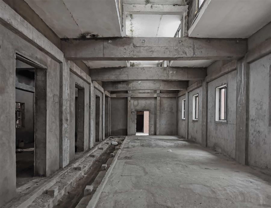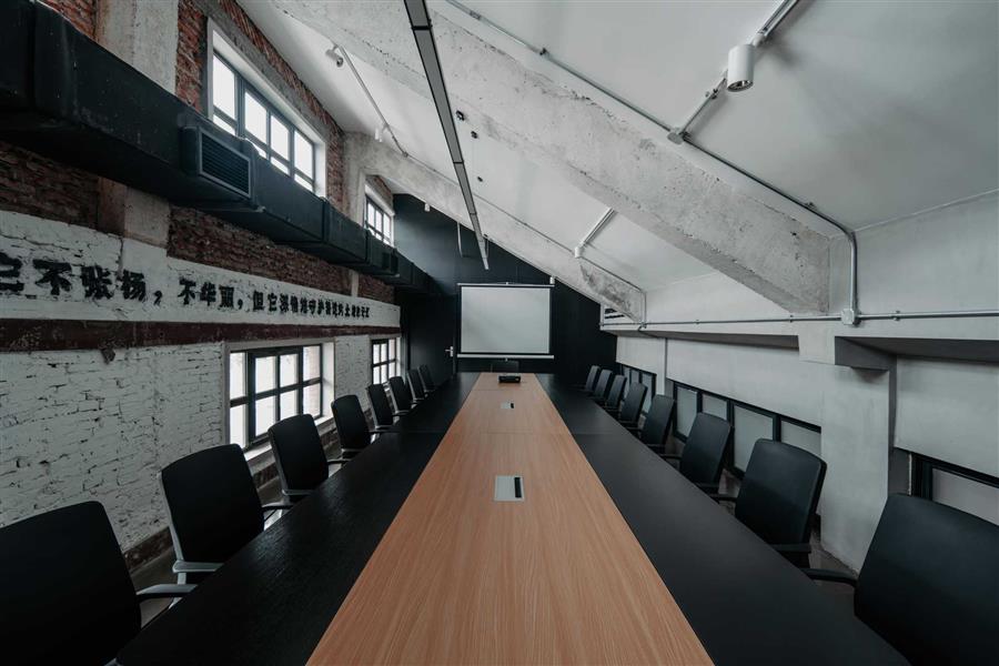 原建筑組團是大尺度的聯(lián)排生產(chǎn)車間。其豐富的屋面變化與獨特的結(jié)構(gòu)形式呈現(xiàn)出工業(yè)建筑的樸素美學與時代印記;獨特的高側(cè)窗構(gòu)造塑造了明亮的內(nèi)部空間;大型生產(chǎn)機械與殘存的紅色標語仿佛在訴說著它們獨有的歷史。面對這些不可再生的工業(yè)遺產(chǎn),我們希望以“弱干預”的方式進行本次改造,盡可能減少對原建筑的拆改,保留其工業(yè)建筑特征。該建筑組團西側(cè)的連廊作為危房已被拆除,只剩下聯(lián)排生產(chǎn)車間。為滿足內(nèi)部通行及管理需求,我們在其西側(cè)新建了公共連廊將彼此孤立的生產(chǎn)車間重新連接。