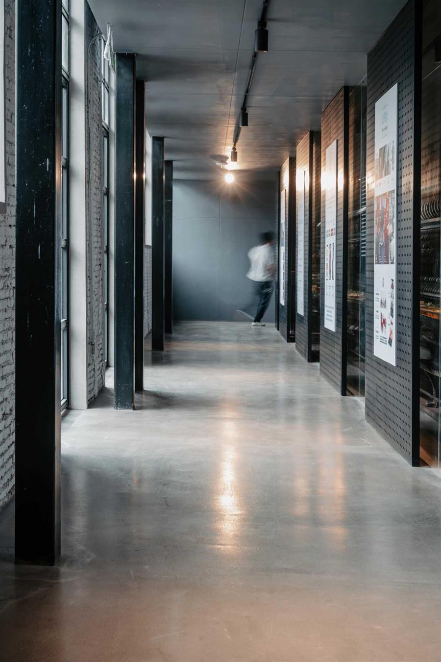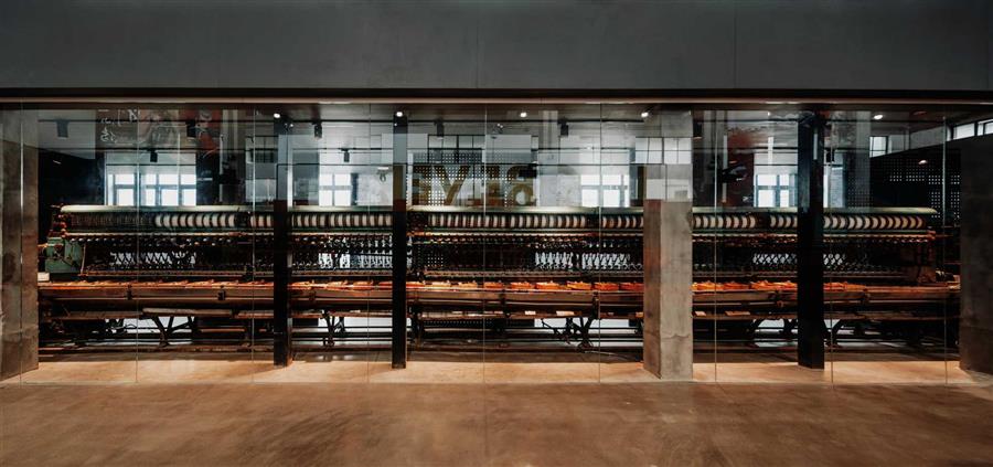 階梯下方保留了一臺煮繭機和一臺復搖機,它們可以在南側(cè)的通高展廊被觀看和觸摸;階梯對面保留了一臺18m長的立繅機作為U·Talk講堂和秀場的背景,同時它也限定出走秀的環(huán)形動線。在巨大混凝土橫梁的高度限制下,兩個橫向連廊成為整個二層空間得以環(huán)通的必要條件。位于二層的合作伙伴中心僅通過一排低矮落地窗便形成一個具有私密性的體量與開放的展覽空間形成對比。