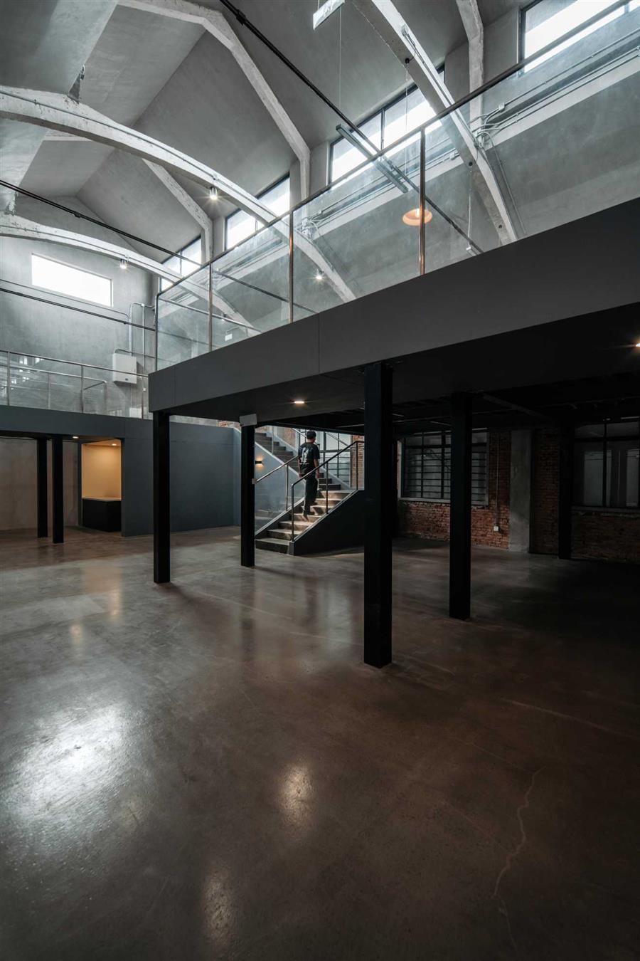 原復搖車間、煮繭車間、蒸繭車間、選繭車間被定義為對外出租的文創(chuàng)辦公空間。其中復搖車間有大小兩個開間,屋面均依靠拱梁支撐并帶有高側(cè)窗,在陽光照射下格外明亮。得益于地面下挖對原始結(jié)構(gòu)鋼索下凈高的緩解,我們可以在其中植入夾層以滿足新增的辦公面積需求。大開間通過局部夾層處理形成縱向的視覺引導,同時保留部分原始生產(chǎn)車間的尺度,形成新與舊的對話;小開間通過整體夾層處理將高處的拱梁序列拉近到眼前,重塑空間體驗。
