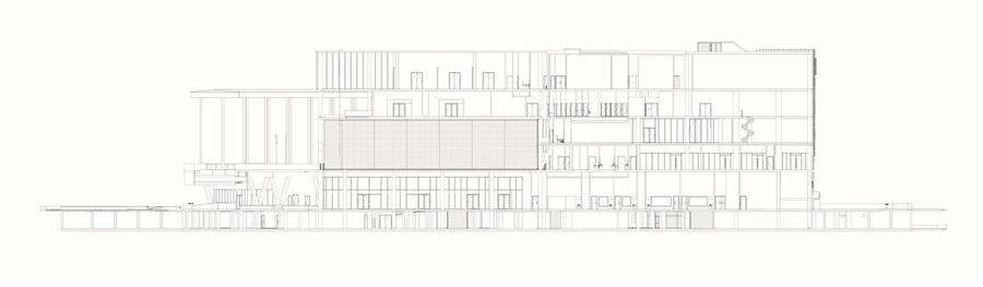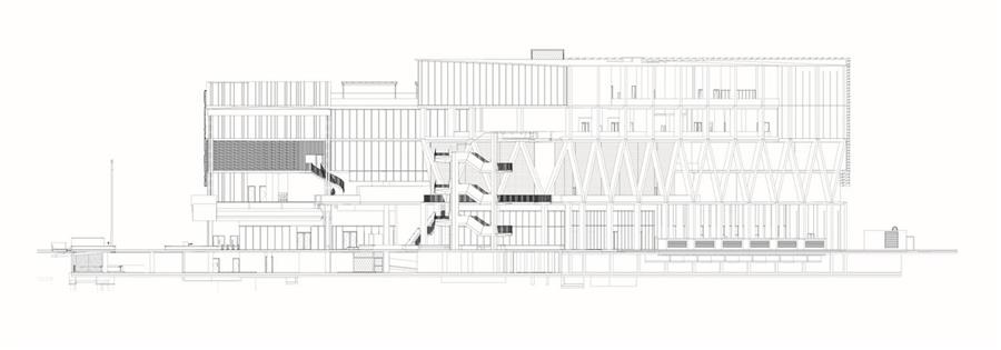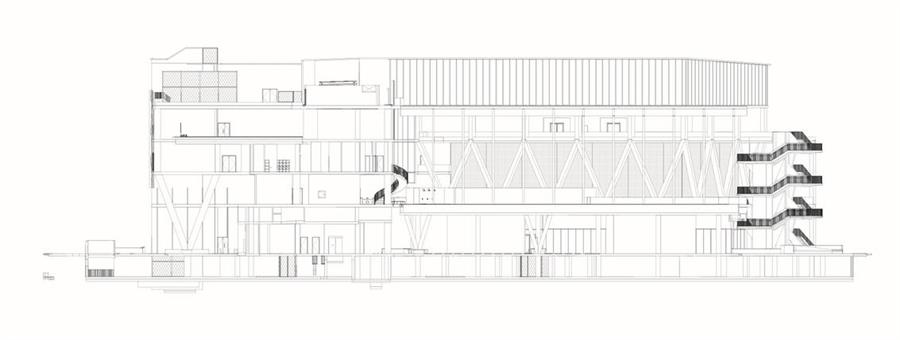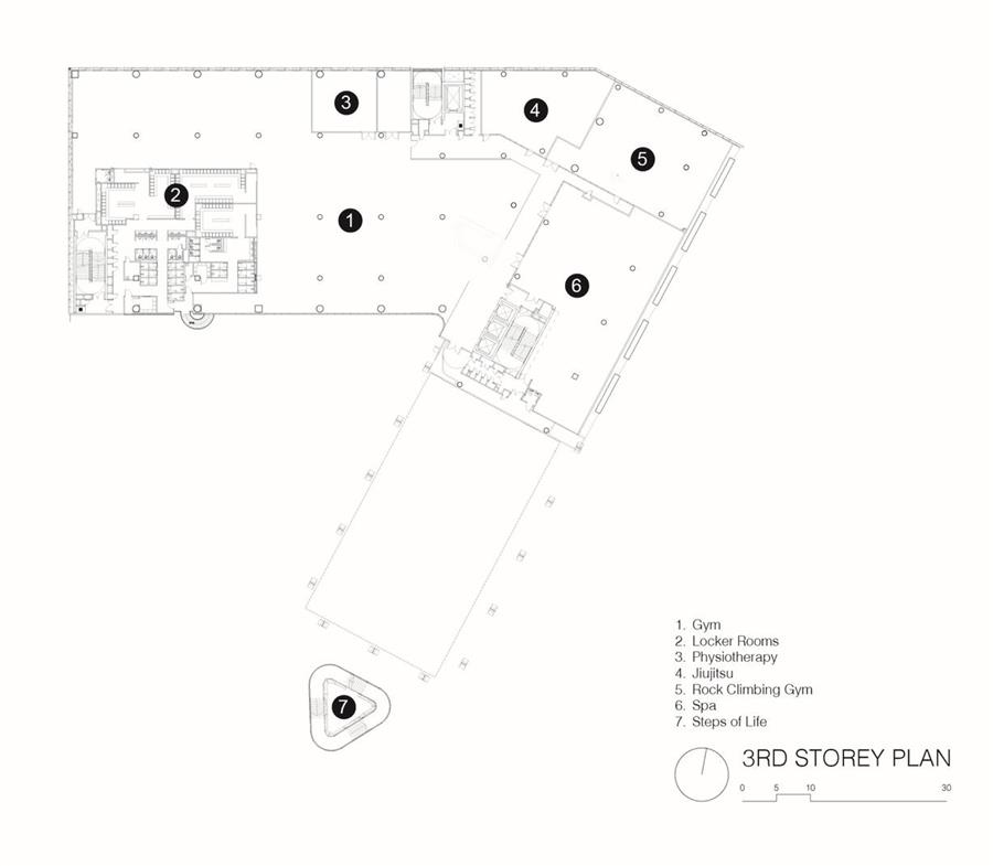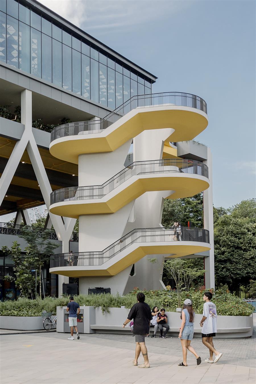 毗鄰?fù)ピ旱?"生命階梯 "是項(xiàng)目的垂直中心,它不僅將會(huì)所內(nèi)的健身設(shè)施連接在一起,還將公園的跑步路線與建筑第四層的空中跑道連接在一起。它體現(xiàn)了積極的流動(dòng)性,邀請游客登上 100 級臺階,打破了健身和公園僅限于地面的傳統(tǒng)觀念。它跨越了公共和私人、水平和垂直等不同領(lǐng)域,為會(huì)所注入了獨(dú)特的活力和熱情。會(huì)所內(nèi)的大容量空間沿建筑的伸展臂布置,以最大限度地利用自然光和交叉通風(fēng)。在空調(diào)空間內(nèi),采用了高性能的雙層玻璃,以減少熱量傳遞,從而顯著節(jié)約能源。