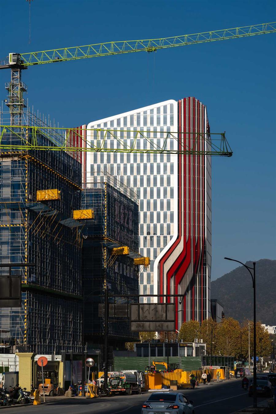 塔樓與沿路的1號樓采用統(tǒng)一的造型語言,頂部和側(cè)面被紅色的曲線勾勒,形成了園區(qū)主入口。在主干道旁形成令人駐足的城市景觀。