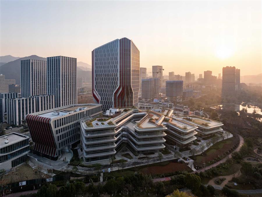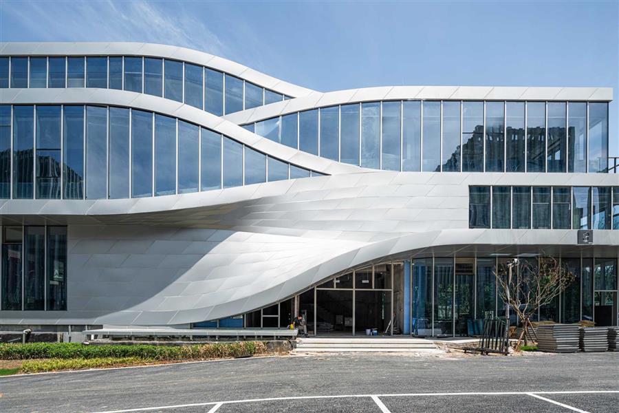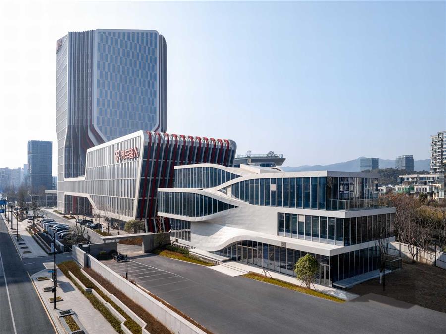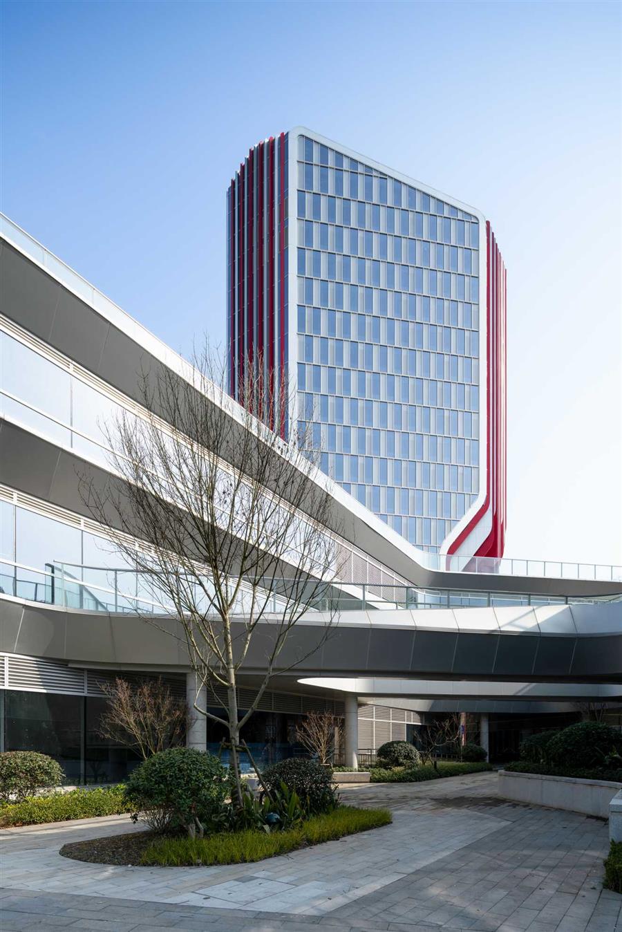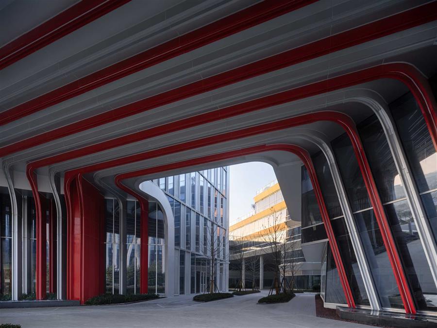 項目主樓的靈感源于汽車腰線,銀色建筑被張揚、動感的紅色曲線層層切割,為銀湖科技城的城市肌理增添一抹獨特亮色。