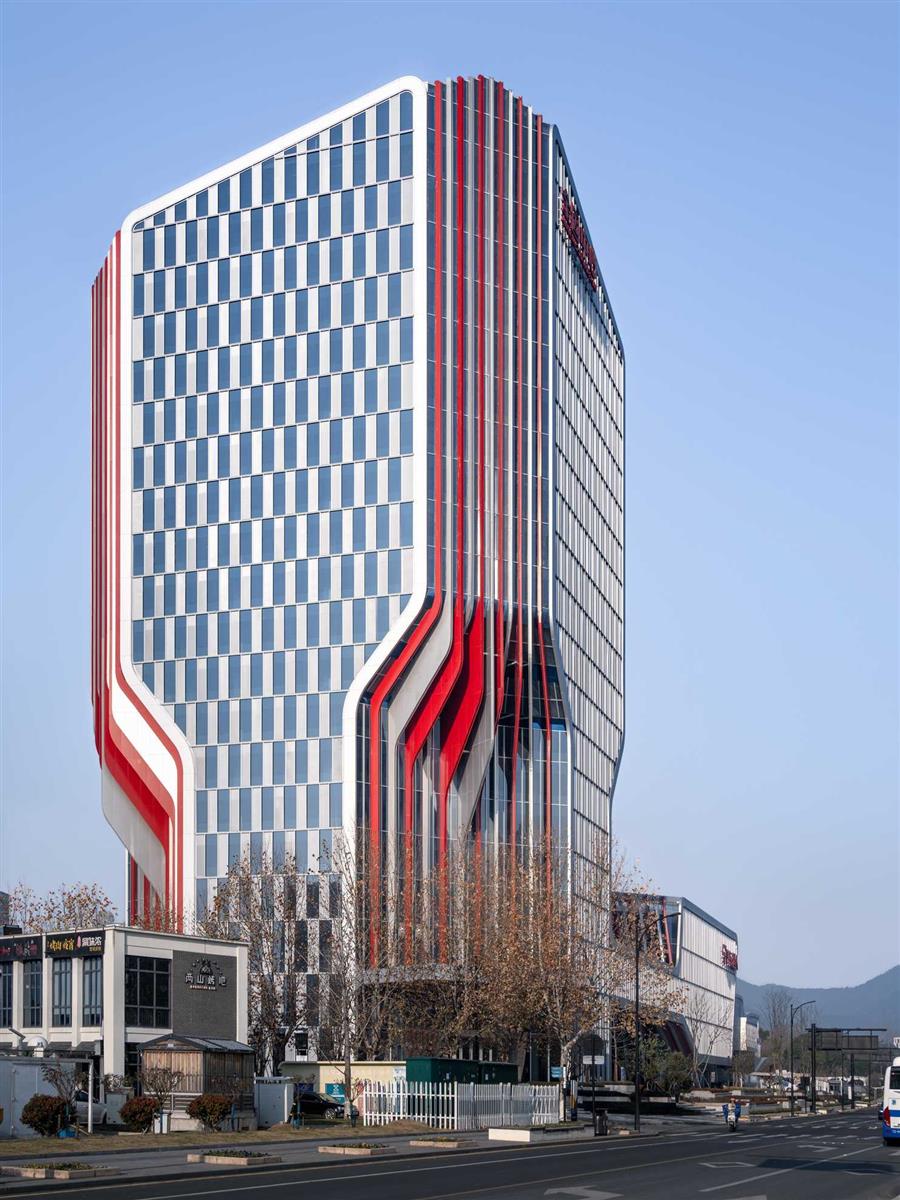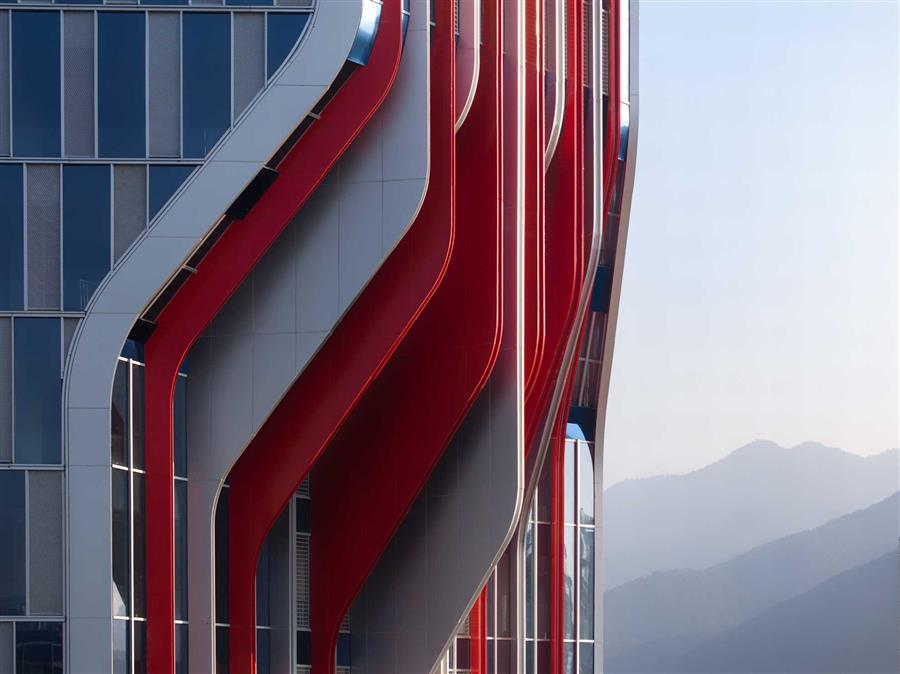 主樓轉(zhuǎn)角分裂成凹凸有致的層疊片狀鋁板, 以熱烈的紅、銀上色,縱向的向量進一步強化了主樓挺拔的視覺形象,帶來強烈的視覺沖擊力。