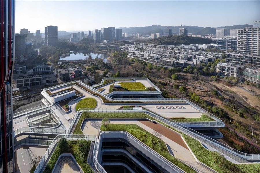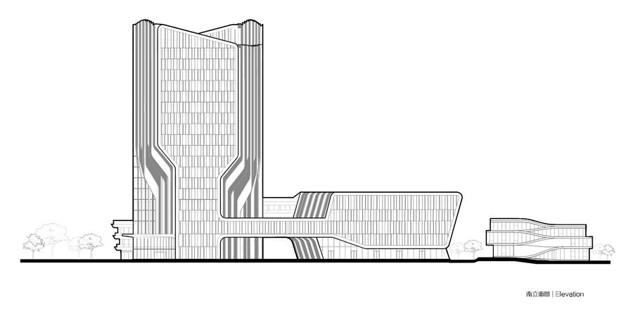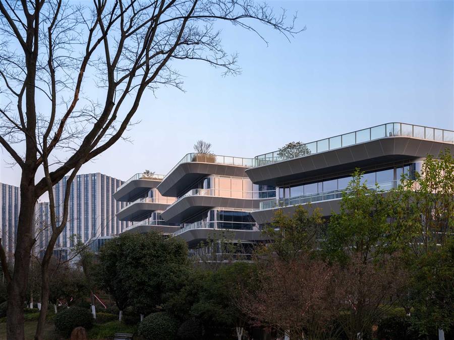 裙房整體朝向銀湖公園層層疊落,植物景觀為屋頂露臺劃分出張弛有度的休憩空間,連續(xù)的動線讓裙房屋頂成為一座可游可玩的空中花園。