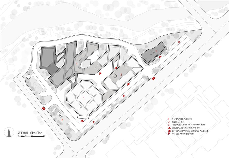 塔樓之下,5座裙房如同五指一般向銀湖公園伸出,公園景觀充分透入園區(qū),真正成為一座景觀之中的辦公園區(qū)。