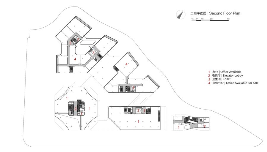 裙房位于塔樓北側(cè),用于對外租賃。建筑體量由大變小,靈活分割的平面布局對中小企業(yè)客戶友好,有利于形成產(chǎn)業(yè)集聚。建筑由東向西呈層數(shù)遞減的趨勢面向銀湖公園,弱化建筑體量,并擁有最開放的景觀視野。