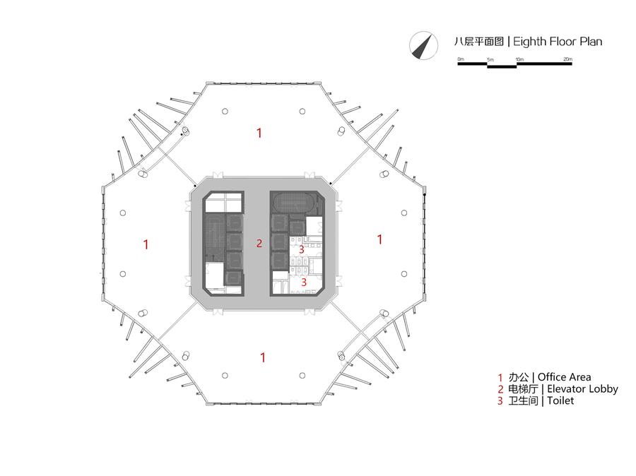 項目地塊建筑限高 80 米,設(shè)計團隊從汽車腰線獲得靈感,對塔樓體量進行切削,八邊形主樓顯得挺拔有力,豐富的立面朝向呈現(xiàn)出多視點的自然山水。