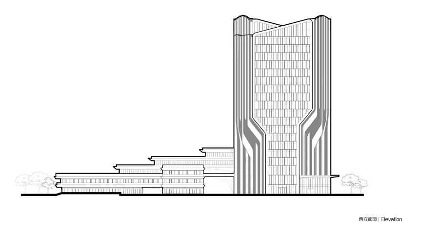 金固中心分為塔樓和裙房兩個部分,塔樓為總部辦公,位于場地南側(cè),毗鄰中國智谷和大型城市TOD綜合體(建設(shè)中),面向城市最大程度地強化建筑的昭示性。
