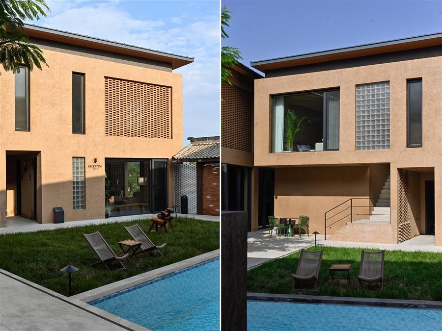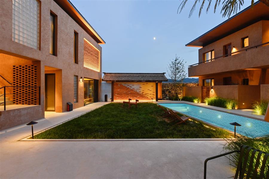 入院門(mén)頭的設(shè)計(jì),因項(xiàng)目緊鄰村道,為了保證更好的入戶體驗(yàn)及私密性,我們將門(mén)頭做成了一個(gè)小小的過(guò)廊,從村里收集來(lái)的老瓦片,采用北京老房的屋瓦樣式進(jìn)行屋面的鋪貼,墻面則選擇用玻璃磚和紅磚混合砌筑,夜晚的燈光亮起,像素化的拼接方式傳達(dá)出一種朦朧的美。