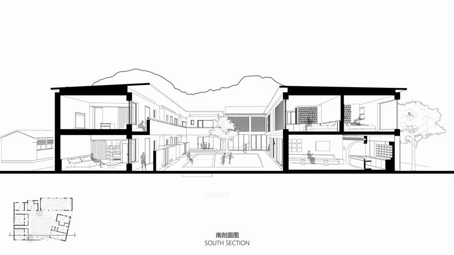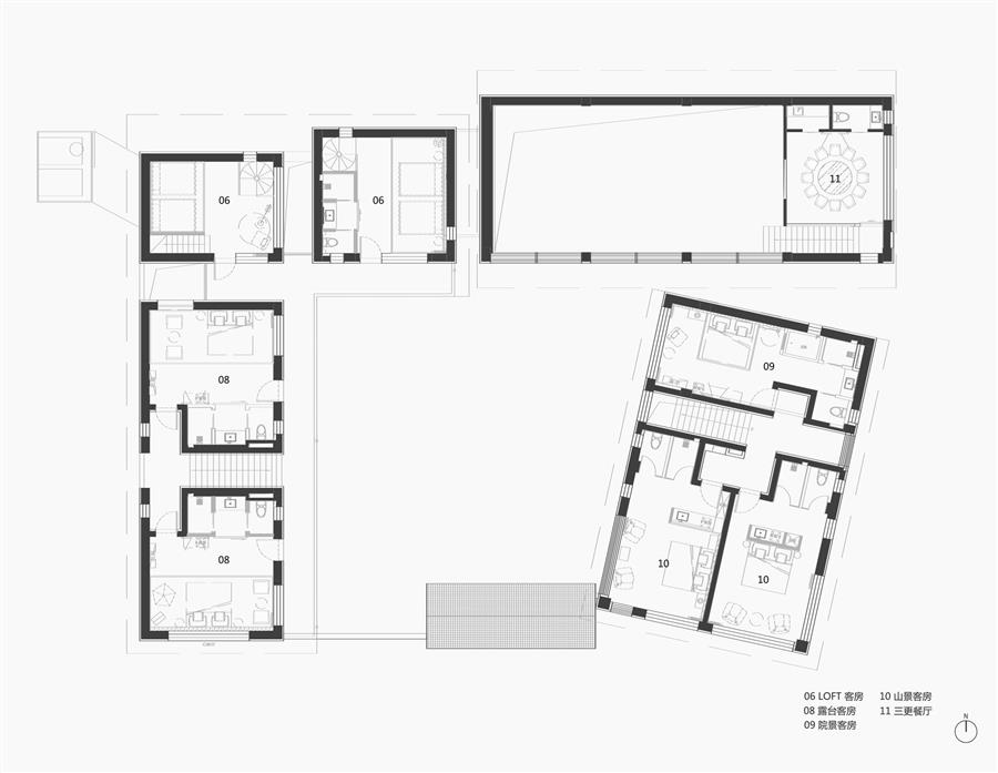 隨著后勤場(chǎng)地的確定,各區(qū)域的功能也就明朗了起來(lái)—將7號(hào)院L型的結(jié)構(gòu)從中間斷開(kāi),留一條后勤通道至后場(chǎng)區(qū),南側(cè)建筑的一層設(shè)置入住登記、后勤布草以及廚房,二層最好的觀山位置則留給客房。