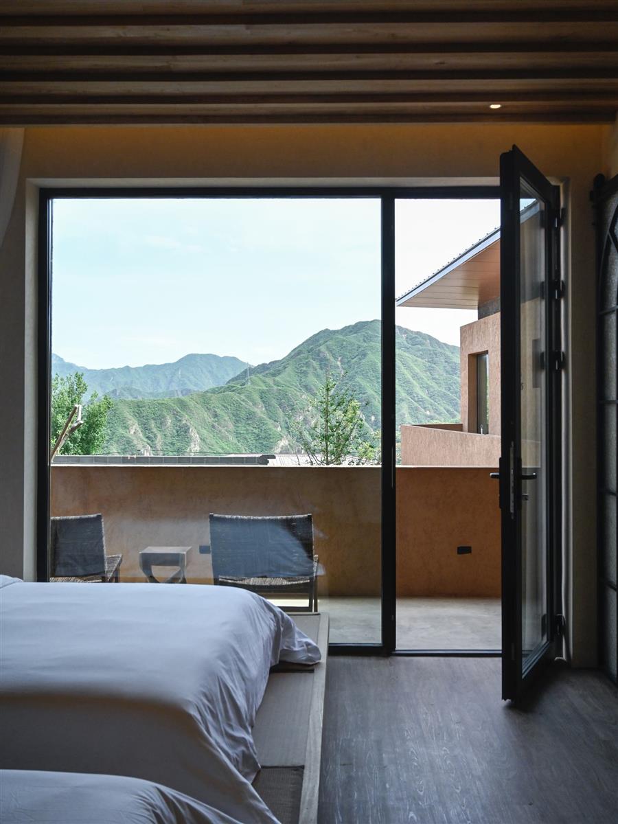 由于基地南側(cè)有著良好的看山視野,而其東、西、北側(cè)的視線均需要被遮擋,為了保證每間客房都能最大限度的享有絕佳的風(fēng)景,面朝南側(cè)及內(nèi)庭院,我們以窗戶作為畫(huà)框,配合著遠(yuǎn)處連綿起伏的群山和白云,形成了一幅流動(dòng)的畫(huà)卷。