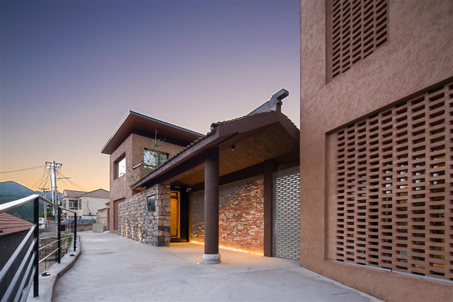 傳統(tǒng)的屋瓦樣式、石砌圍墻與新的金屬屋面、玻璃磚形成一種新舊的對(duì)比,而原址老建筑的記憶也通過(guò)這一入口得以存留。