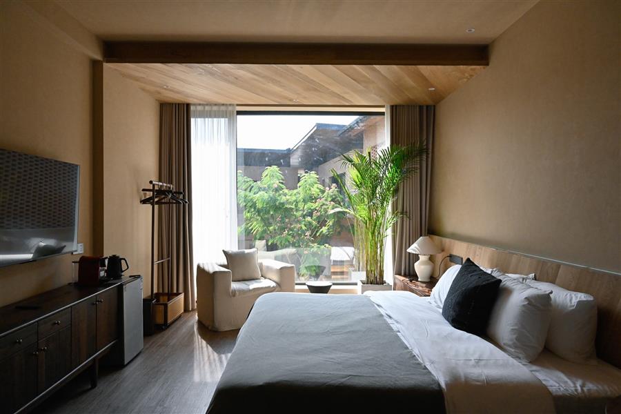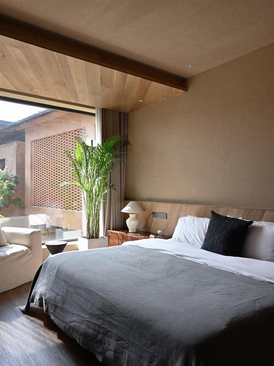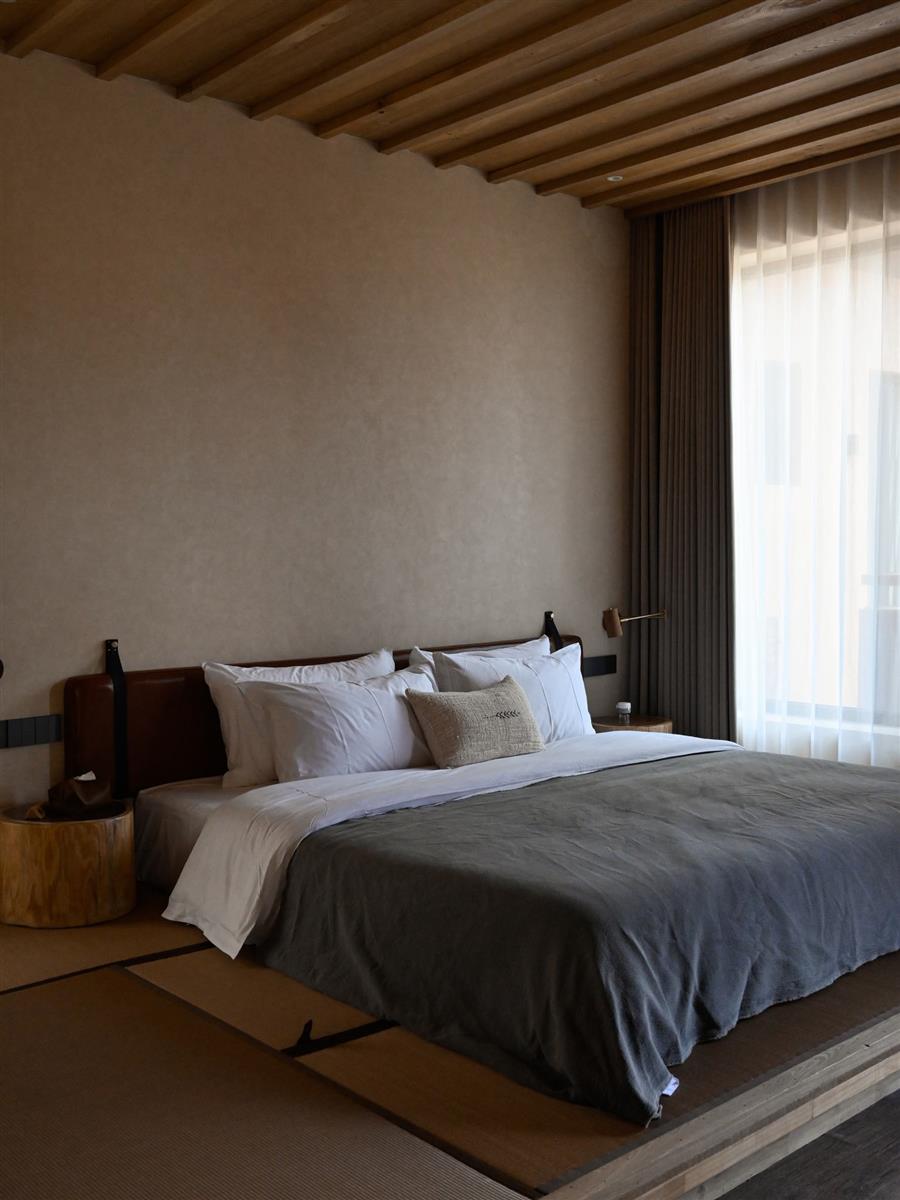 客房整體在延續(xù)建筑外部風(fēng)格的基礎(chǔ)上,去裝飾化,用簡(jiǎn)潔的空間語(yǔ)言增強(qiáng)與戶外山景的聯(lián)動(dòng)性,不喧賓奪主,也使得房間內(nèi)能夠“呆得住”。由于市場(chǎng)運(yùn)營(yíng)對(duì)房型的要求,我們并沒(méi)有一味追求客房的同質(zhì)化,而是通過(guò)不同軟裝、房型將其進(jìn)行區(qū)分,求同存異,也使顧客有更多的選擇。