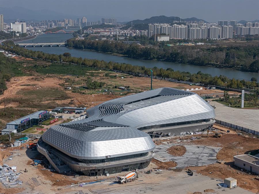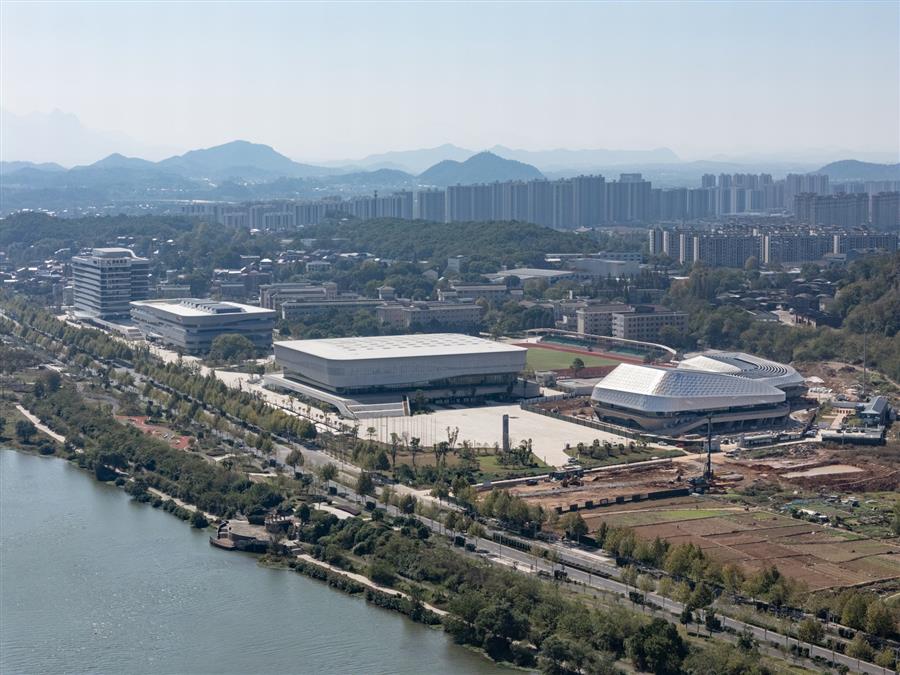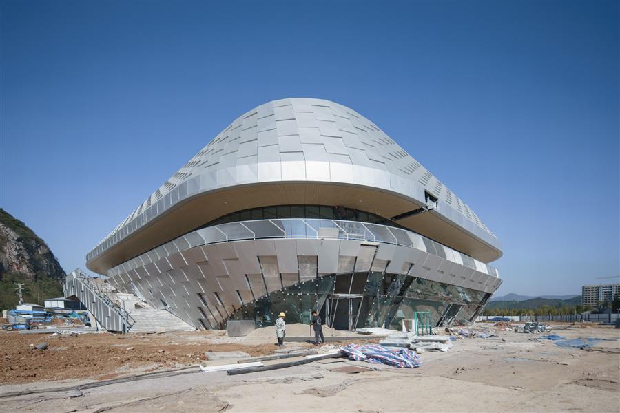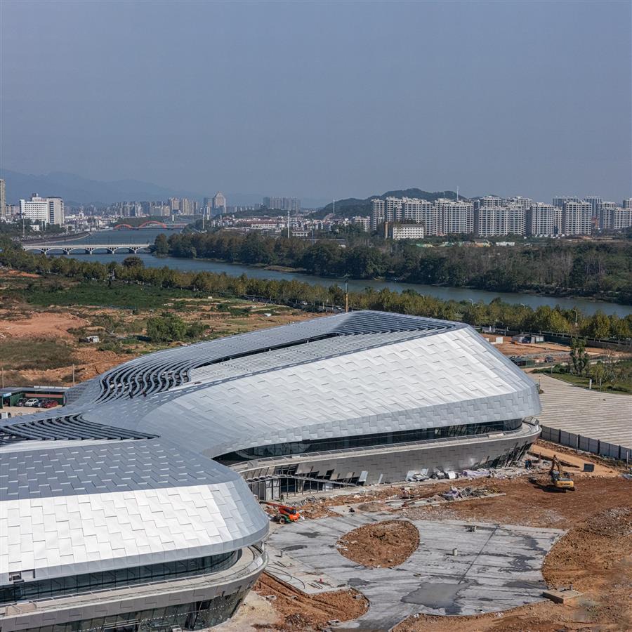 江山市群眾體育中心游泳館由零壹城市建筑事務(wù)所(LYCS Architecture)牽頭進行建筑室內(nèi)一體化設(shè)計。近日,隨著最后一塊鱗片歸位,游泳館蟒袍加身,流淌的曲線與江山港的粼粼波光交相輝映。
