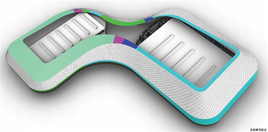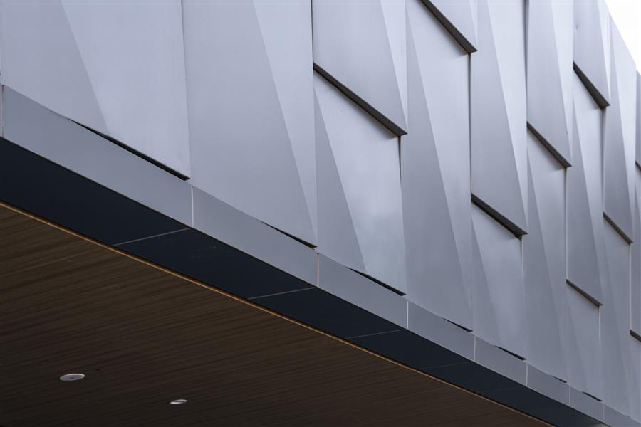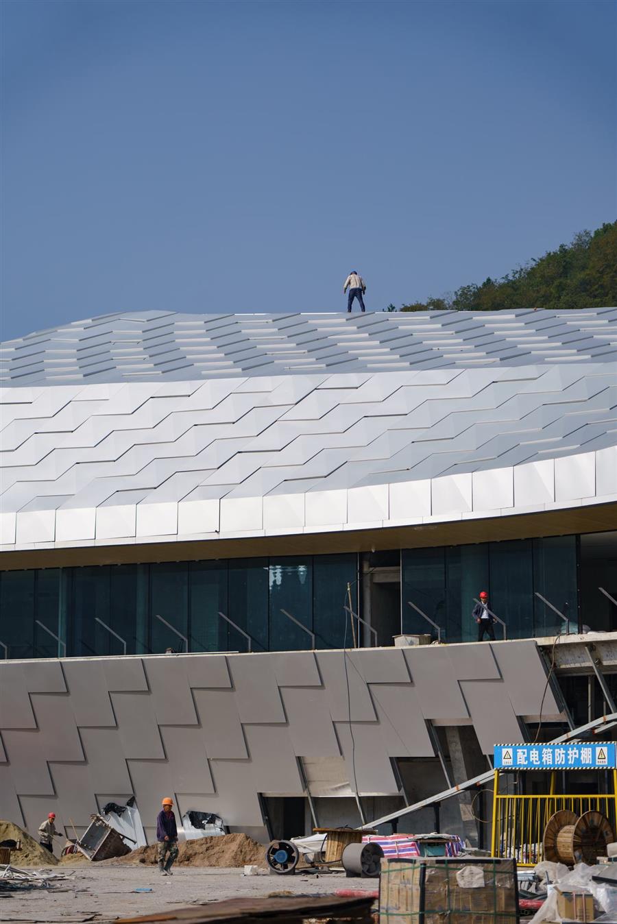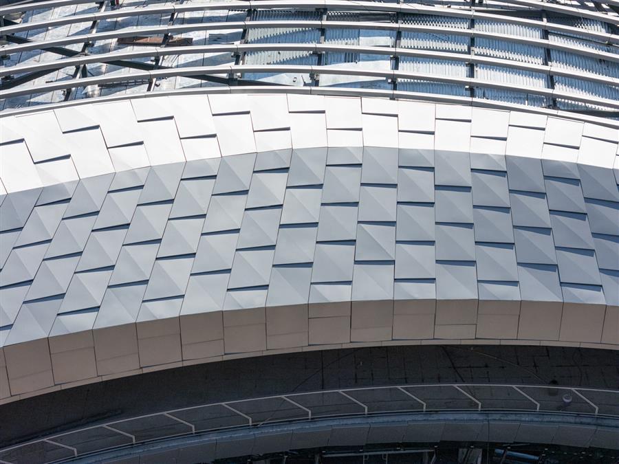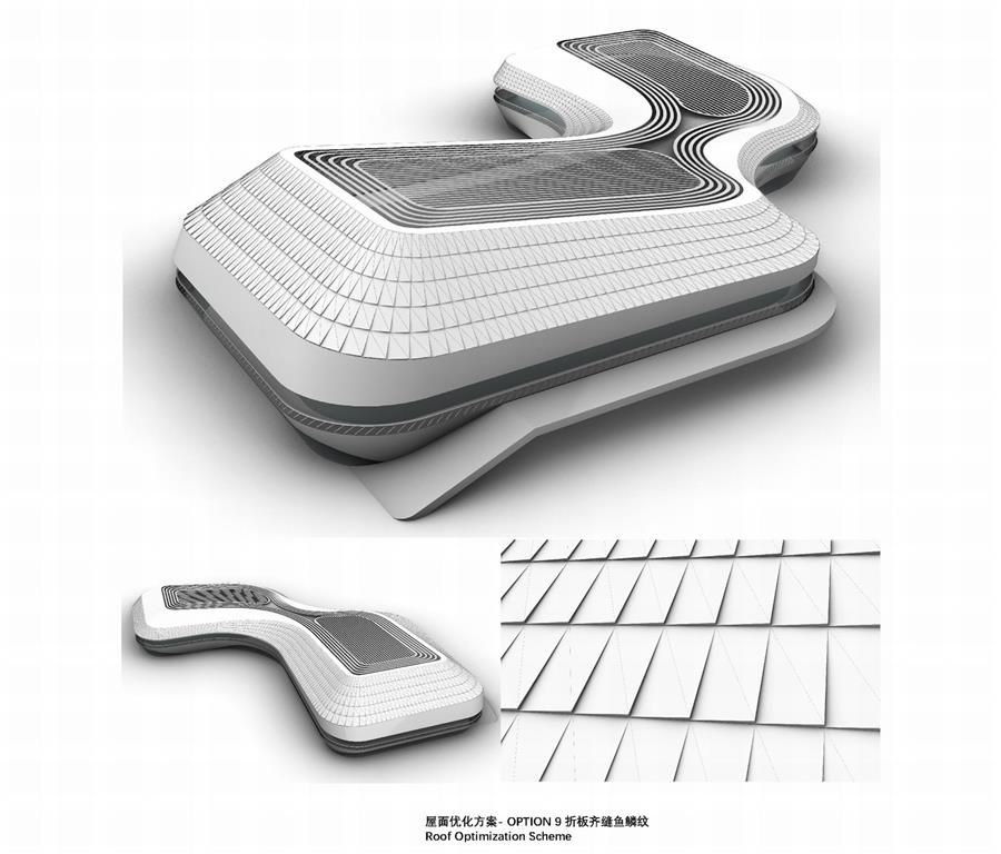 折板錯縫方案的每塊金屬板上有一道折痕,隨著光線變化,會產(chǎn)生一種優(yōu)美的鱗片的效果。設(shè)計團隊希望通過這道道折痕,在整體曲線之外,點線結(jié)合,給造型再增加一個視覺層次。