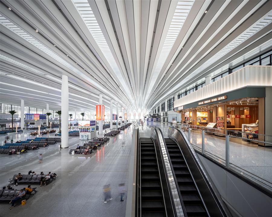 這是一個(gè)人群被光引導(dǎo)的空間。雖然是地下2層,但直射和漫射光會(huì)隨著早中晚的推移形成光影變化的環(huán)境。光谷就在這些細(xì)微的變化中歡迎著來(lái)到這座城市的人們。這里是站城一體化的出發(fā)點(diǎn),也是人們舒適旅程的起點(diǎn)。