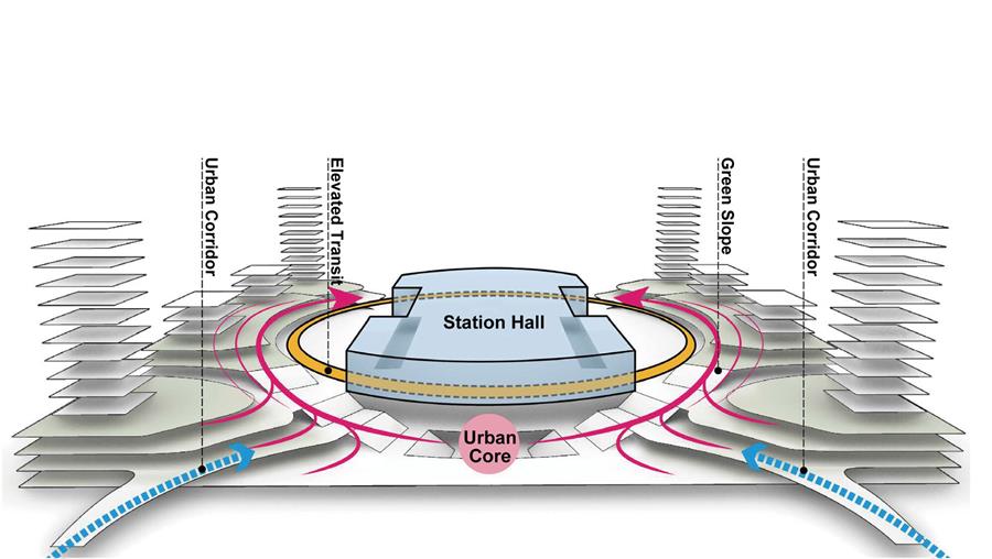 該項(xiàng)目主要有三大特點(diǎn),分別是實(shí)現(xiàn)“用車(chē)站縫合城市”的“綠環(huán)(Transit Loop)”,吸引客流的“花瓣(Grand Canopy)”,以及明亮的換乘空間“光谷(Station Core)”。