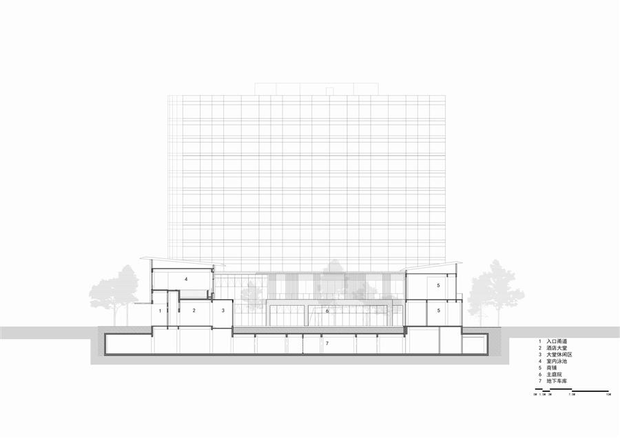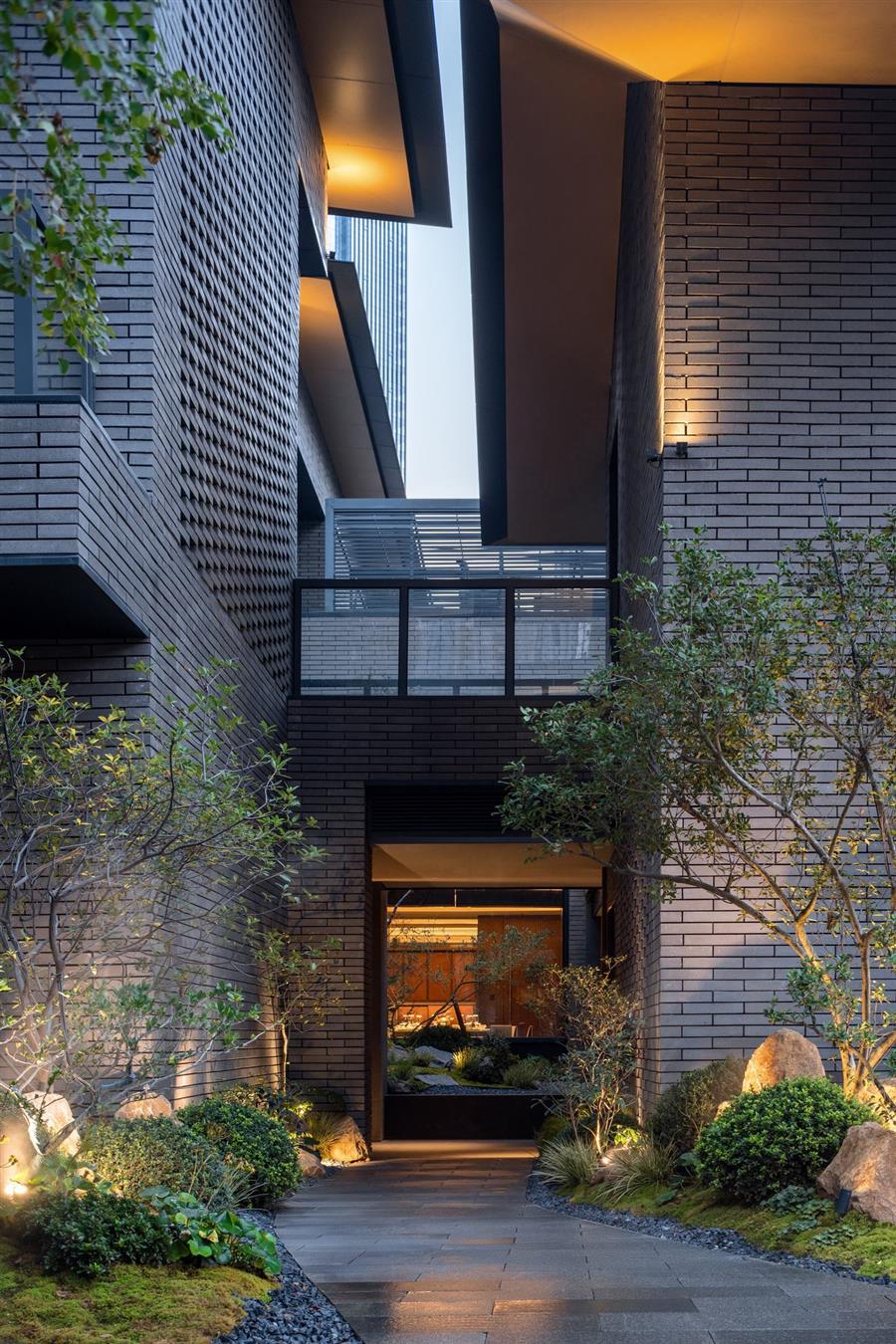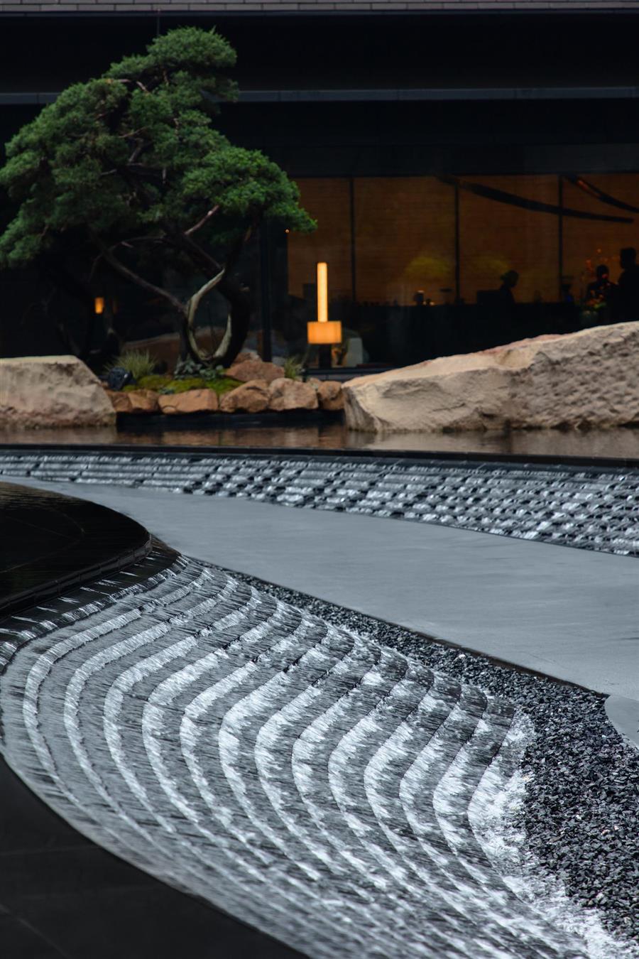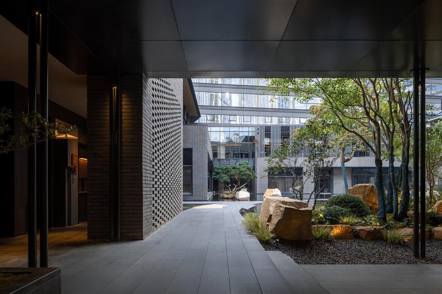 區(qū)別于商務酒店入口的豪華、高大的常規(guī)設置,我們以林路迂回,將酒店入口遠離嘈雜的主車道,行車落客處不作任何筆墨華彩,僅設一樸素門洞,沿幽深洞口轉(zhuǎn)折復行十余步而進入酒店大堂,則忽而豁然開朗,二十米長的中庭景觀如山水畫卷徐徐展開,引發(fā)旅客的驚嘆。