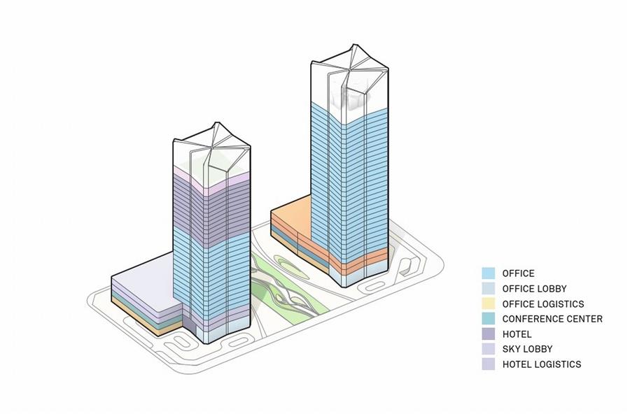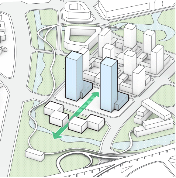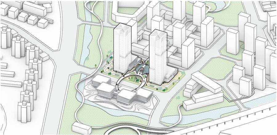 考慮場(chǎng)地地塊間容積率差異和整體城市觀感,設(shè)計(jì)采用一體化策略,系統(tǒng)性布局三個(gè)地塊與中央公園。容積率較高的首排建筑向兩側(cè)依次排開(kāi),面向公園舒展雙翼,穩(wěn)穩(wěn)承托起后方的地標(biāo)雙子塔,共同勾勒出逐級(jí)攀升、錯(cuò)落有致的城市天際線。巧妙的空間布局,不僅實(shí)現(xiàn)開(kāi)發(fā)強(qiáng)度的合理分配,還創(chuàng)造與公園景觀相得益彰的城市空間序列,塑造出融合生態(tài)、科技與人文的城市有機(jī)體。