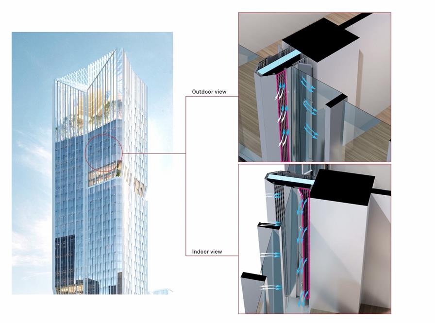 智慧生態(tài)技術(shù)系統(tǒng)的運(yùn)用,更是生動(dòng)詮釋了“楚水漢界”的哲學(xué)智慧。塔樓的綠化屋頂有效提高隔熱效能,立面采用高太陽(yáng)反射值的材料,增加太陽(yáng)輻射反射效率,其豎向線條細(xì)節(jié)可與建筑通風(fēng)器結(jié)合,無(wú)需開(kāi)窗亦可改善室內(nèi)氣候感受,打造精致簡(jiǎn)約形象的同時(shí),整體達(dá)到減緩熱島和節(jié)能的效果。