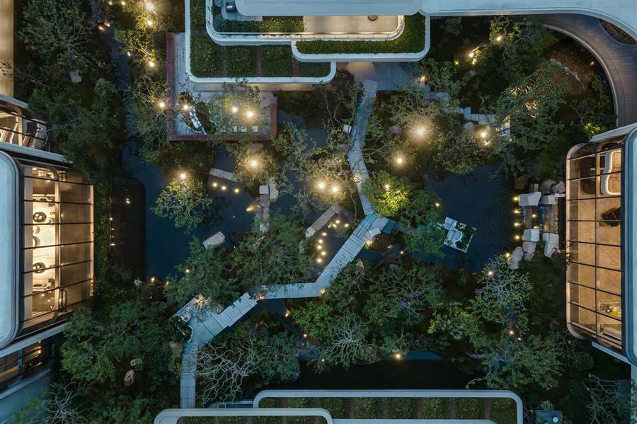 以川西林盤為靈感,打造一座藍(lán)綠交織的立體社交花園。