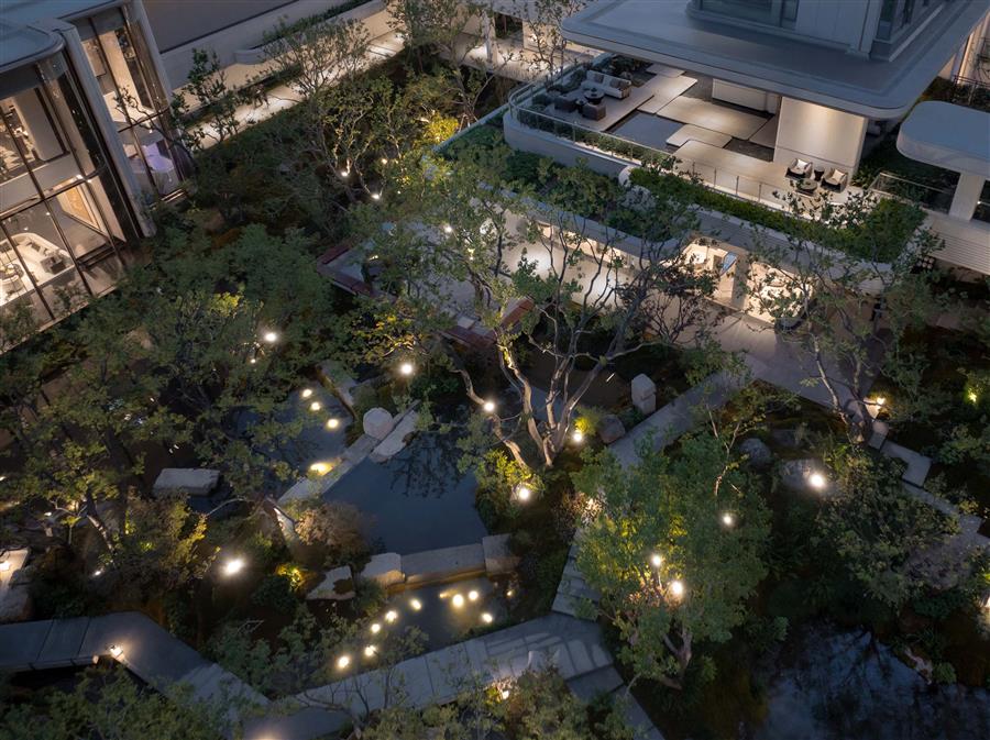 享受無界——感受自然返璞氣息,做一個不假外物的自由隱士。專屬會客門庭,樹從下沉庭院向上無限延伸,與水景無限交融。