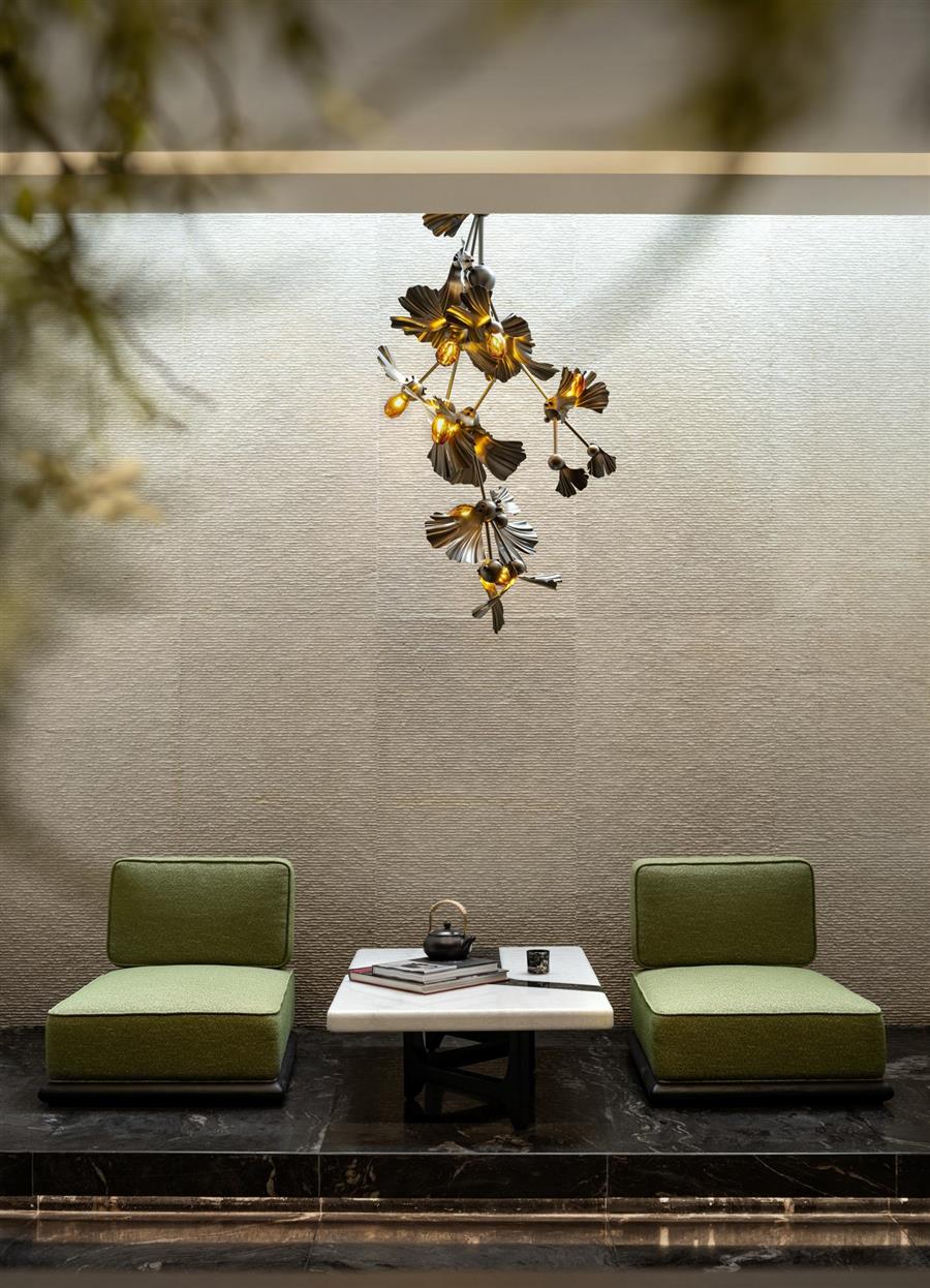 打開的空間讓它極致生長,夾層之下品茗區(qū),以地臺(tái)高低的形式梳理此處層次,銀杏吊燈設(shè)計(jì)結(jié)合簡約與復(fù)雜立體構(gòu)成,奇妙的視覺效果滿足照明與裝飾功能,借天井傾瀉而下的光幕,如絲綢般在上下層間延展。品茗、待客不再是熱愛更是一種生活習(xí)慣。實(shí)景作品的產(chǎn)物呈現(xiàn)的不僅是生活更是閱歷,更是將不同文化鐫刻至此。