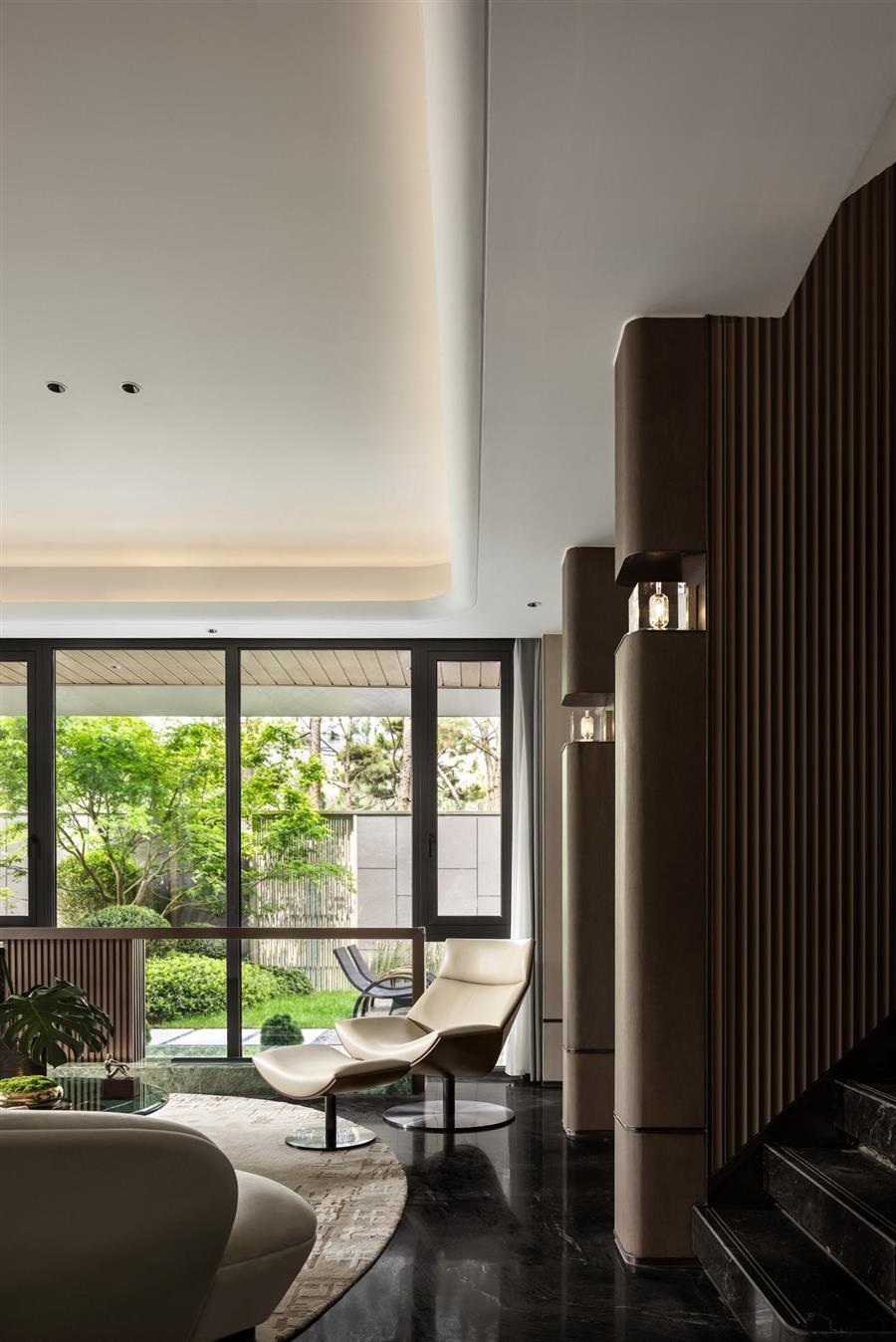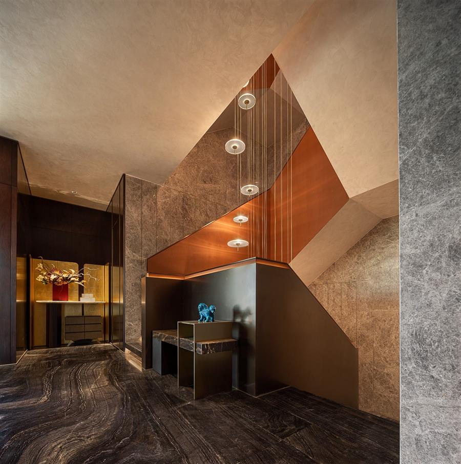 “以張為發(fā),以弛為蓄”,那樓梯間的落燈自上而下筆直垂落,圓盤搭配線性燈鱗次櫛比,循環(huán)而上猶如春日湖面雨落微波,徐徐蕩漾。光與影在空間中不同層次的藝術(shù)表達(dá),順著樓梯扶手層層疊進(jìn)扣人心弦。樓梯略帶擴(kuò)張的轉(zhuǎn)角迎風(fēng)而上,指引著空間精神本質(zhì)。大家風(fēng)范,領(lǐng)者姿態(tài)于踏步之間彼此穿插,為空間的視覺構(gòu)建與感官賦予雙重享受。