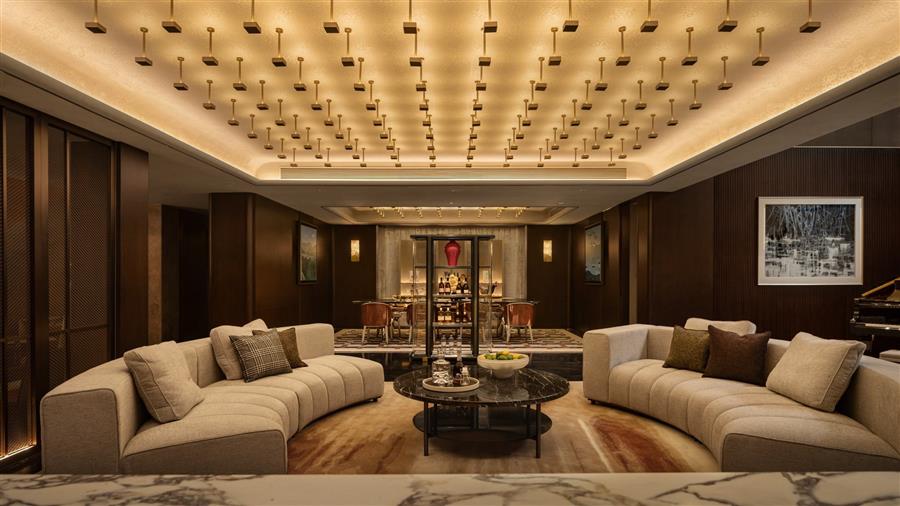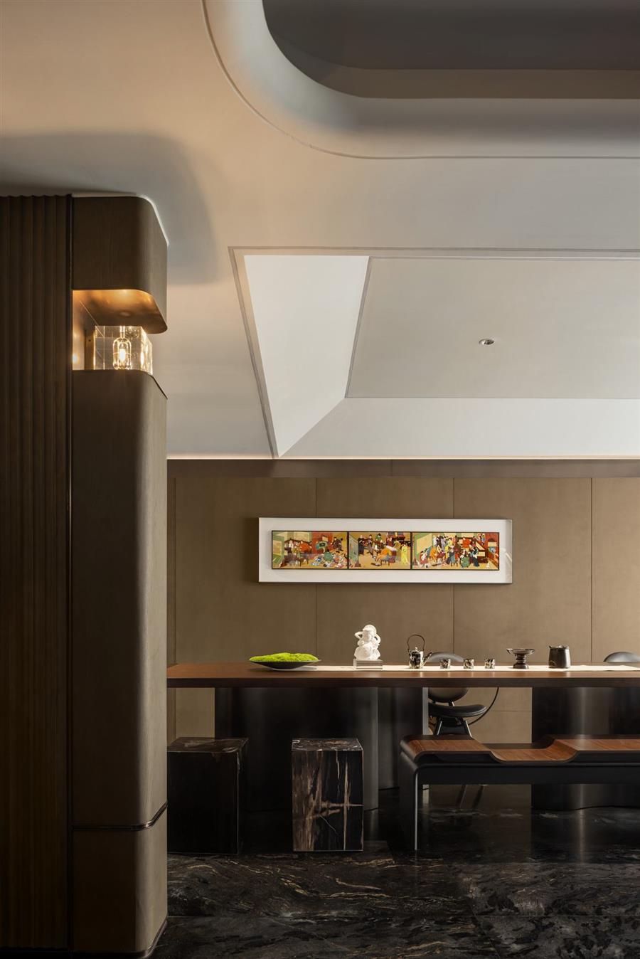 在軟裝上,中熙設(shè)計(jì)保持中國人骨子里的待客之道,以圍合的對(duì)話方式陳列,木色飾面與奢石,在柔和的壁燈映射下,呈現(xiàn)出氤氳的朦朧感,耳邊傳來膠片的聲響,光陰與歲月在此靜靜地沉淀與流淌。