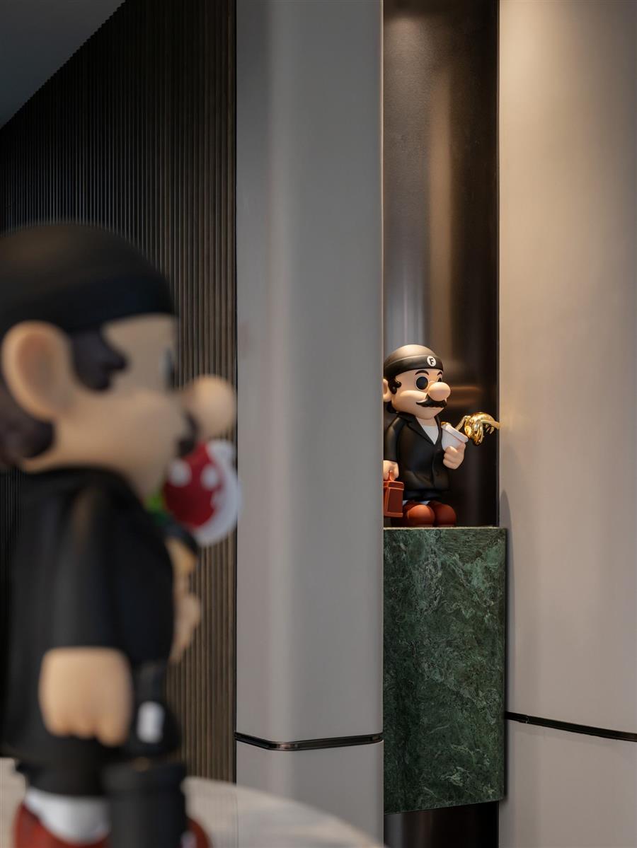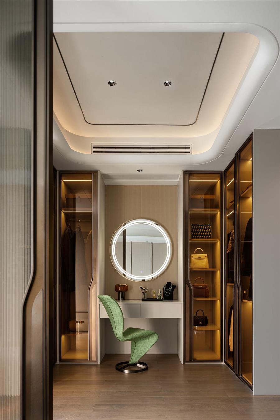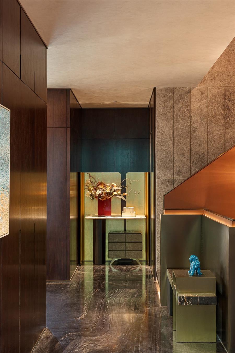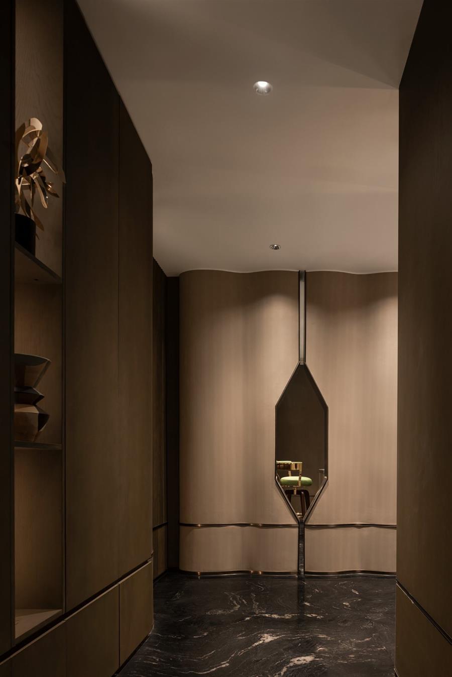 對(duì)于墅居的歸家秩序,不僅是布局上的嚴(yán)謹(jǐn),細(xì)節(jié)上的表達(dá)更是一種居家的柔情。在設(shè)計(jì)的過程中,同一高度的三盞內(nèi)嵌燈,弱化陽角問題,上下木飾包裹,以溫潤的質(zhì)感和典雅照明自下而上的歸家動(dòng)線、暖意綿長。