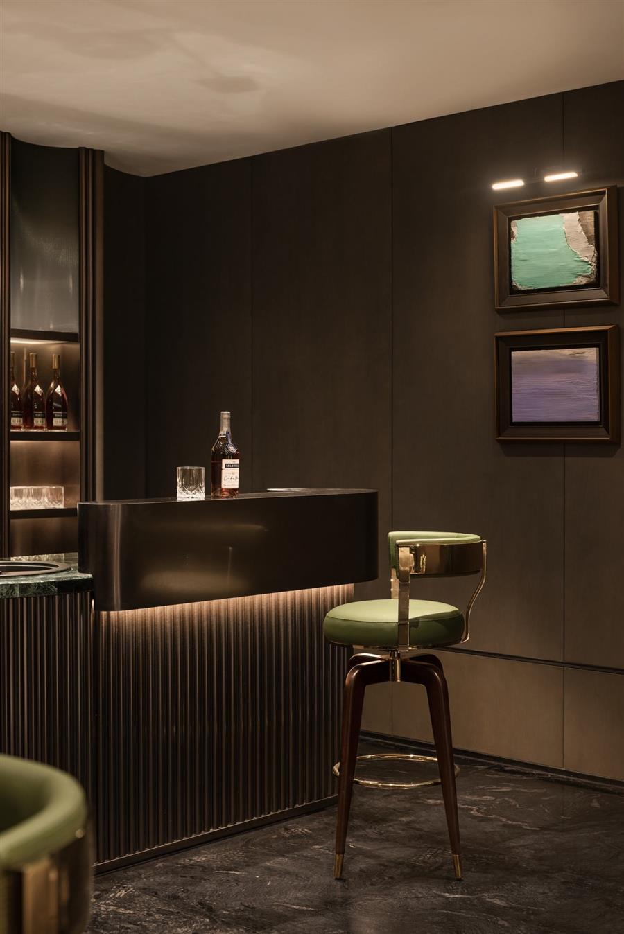 臨窗而坐,推窗即景。室內(nèi)空間與庭院景致相映成趣,隨意安置一把椅子,便可隨處可憩。由外至內(nèi)隨著水波泛起的漣漪,遞進(jìn)式地形成了自由淺洽區(qū)和親密自在的品酒區(qū),兩者互不干擾。大面積奢石、古銅金屬、有負(fù)一生長于此的滿墻材質(zhì),繼而呈現(xiàn)出沉穩(wěn)、休閑的質(zhì)感。