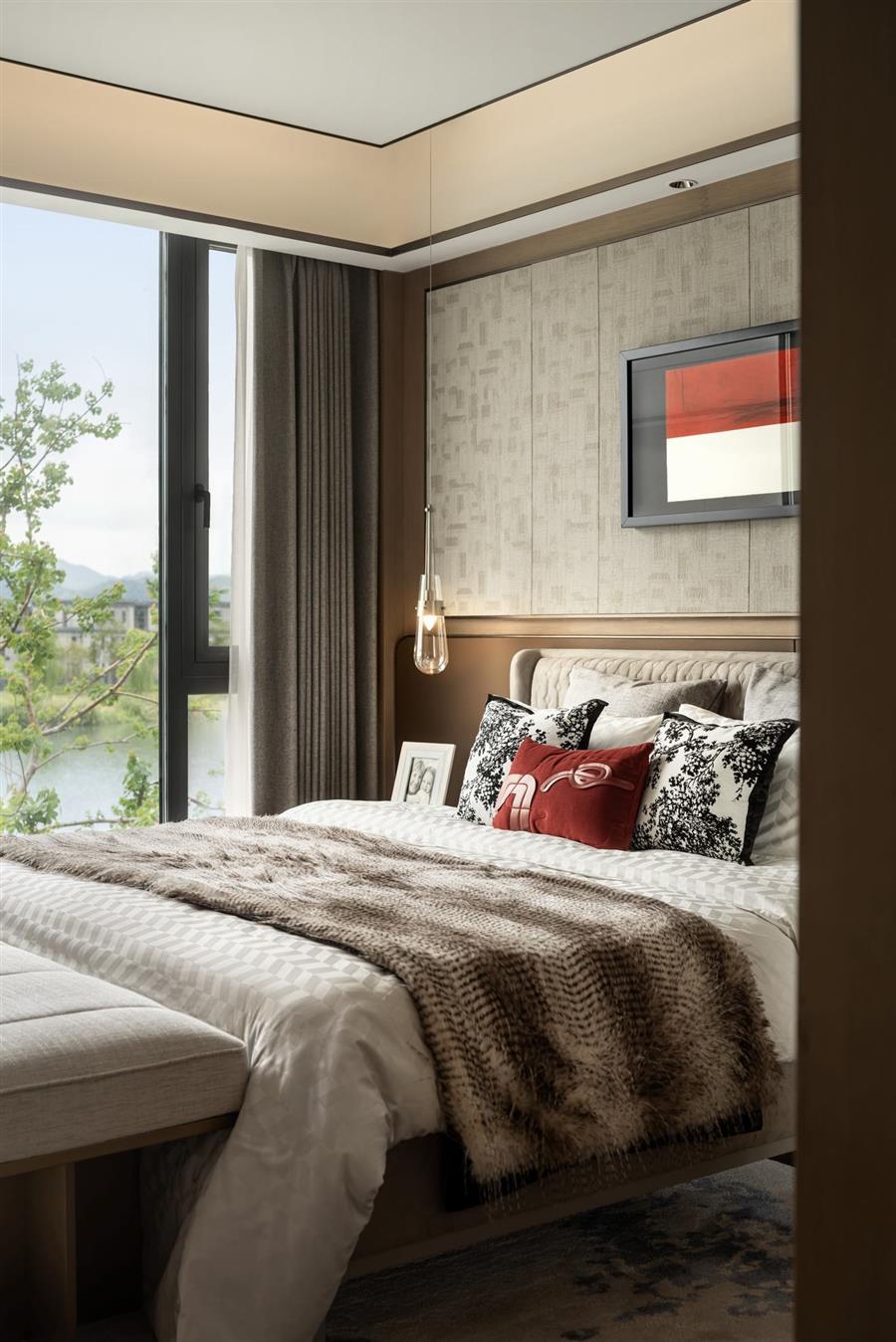 步入休閑區(qū),以圓弧轉(zhuǎn)角過渡,床頭背景的造型利用木飾面做材質(zhì)以及豎列隔柵做疊加。獨(dú)具趣味的擺件安置于每一個(gè)空間,為休閑區(qū)域帶來別樣的柔情和身份的標(biāo)簽。