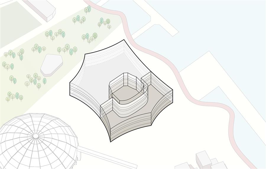The new theater is conceived as one half of a yin-yang partnership with the newly opened West Bund Dome, a renovated and adaptively reused historic structure adjacent to the theater. The dome is translucent, exuding light in the evenings, while the theater is monolithic and abstract. The dome was once a pre-homogenization facility for China's largest cement production plant; the theater celebrates this heritage as a new concrete mass. Glass Fiber Reinforced Concrete (GFRC) was designed in a series of horizontal organic forms that are composed to mimic the constant movement of the Huang Pu River.