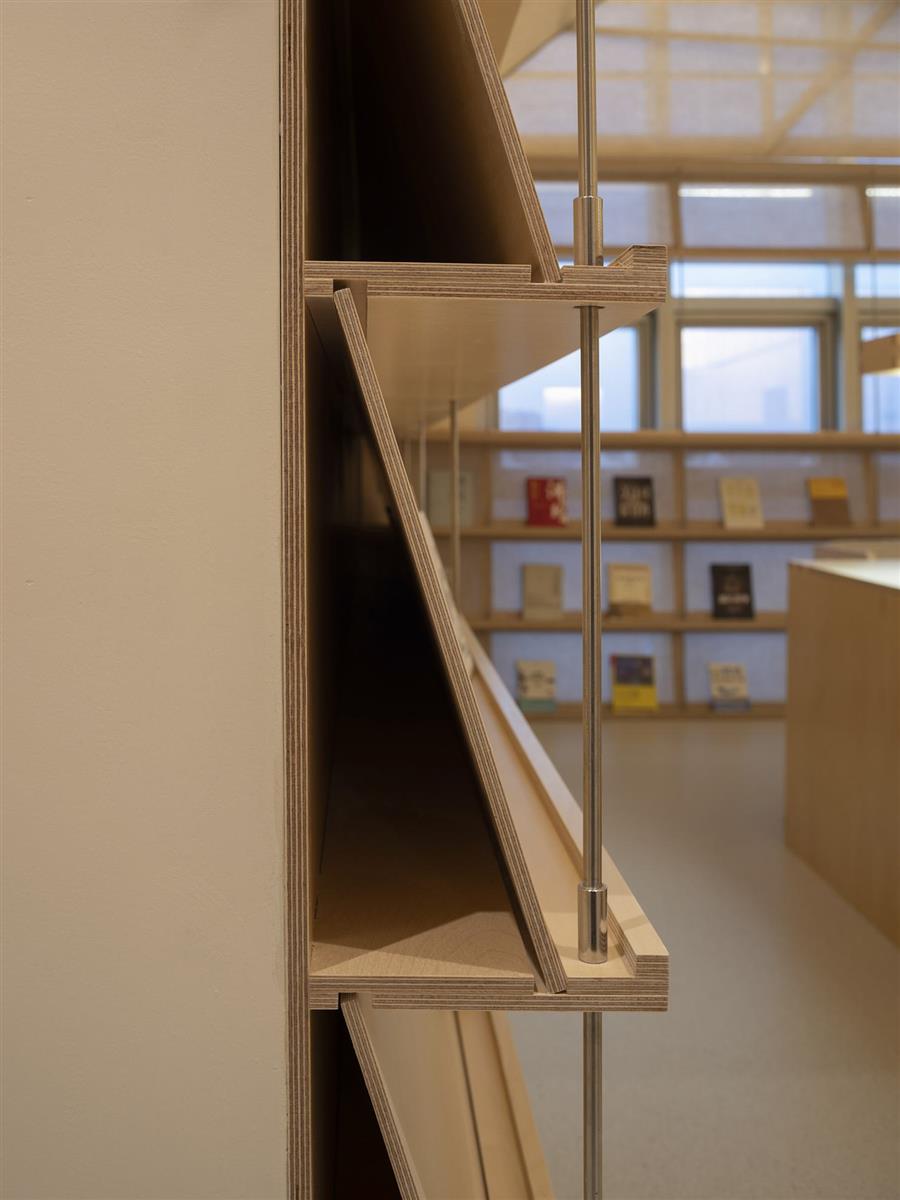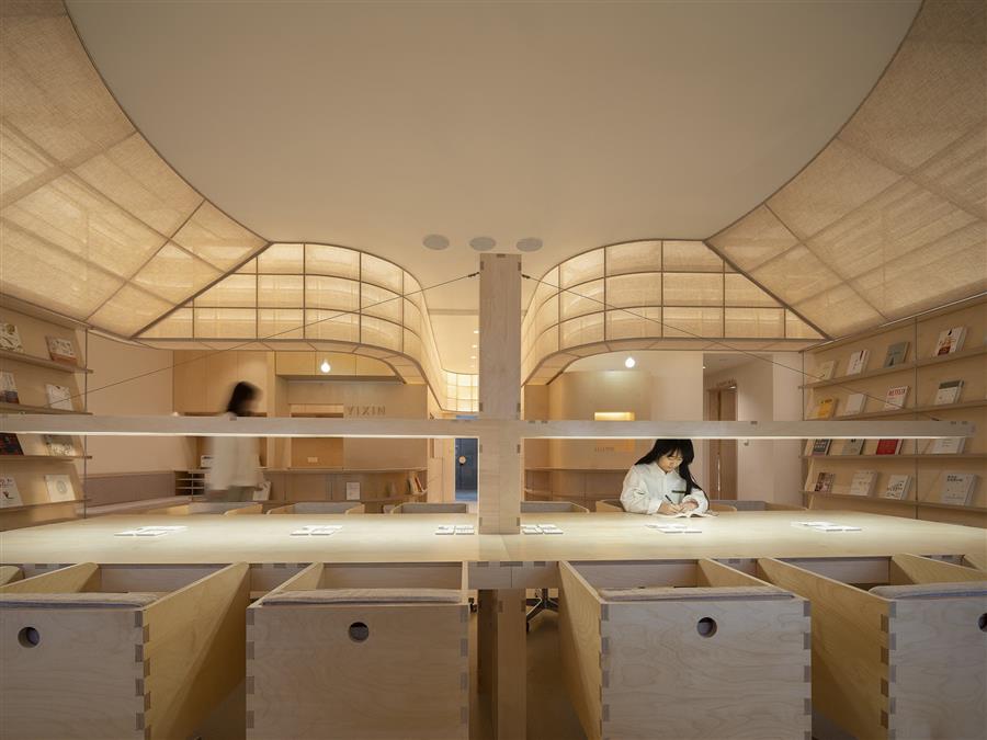 一盞懸浮的燈籠意向裝置仿佛空間的精神圖騰,安靜的盤旋在空中。樺木多層板經(jīng)數(shù)字化設(shè)計,構(gòu)建出精細(xì)的榫卯細(xì)部,其木質(zhì)骨骼隱于布料之后,若隱若現(xiàn),當(dāng)光線穿透時有了呼吸的節(jié)奏。白天,日光溫柔地穿過布料與木骨架的間隙,在書桌上投射出層次豐富的光影,靈動而詩意。夜晚,溫暖的燈光透過半透紗幔,在頂部暈染出一片柔和的微光,仿佛漂浮的夢境。這個懸浮的發(fā)光裝置不僅是功能性的照明系統(tǒng),更是空間的精神象征,其投影隨著太陽角度在12小時內(nèi)完成從實(shí)到虛的形態(tài)漸變。
