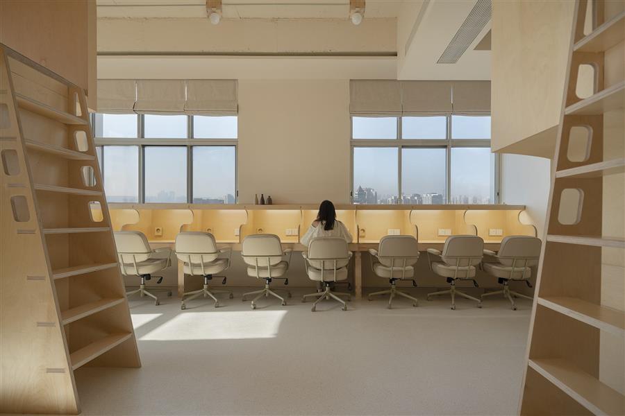南京市新街口的寫字樓高空中,懸浮著一座與城市對話的精神容器。當(dāng)推開玻璃門的瞬間,城市轟鳴即刻被抽離,眼前展開的是一片由樺木、織物與光編織的有機(jī)系統(tǒng)。多么工作室以建筑學(xué)視角重構(gòu)當(dāng)代都市人的學(xué)習(xí)空間,在百米高空演繹空間敘事與身體感知的協(xié)奏曲。