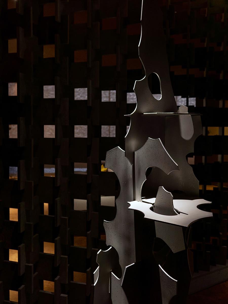 通高的入口門扇營造出具有張力的抵達(dá)體驗。緊接內(nèi)部的鏤空水泥板榫卯拼接屏風(fēng),配合張華老師為內(nèi)向空間所創(chuàng)作的雕塑作品,藝術(shù)氣氛逐漸蔓延開來。