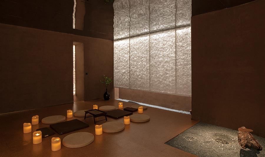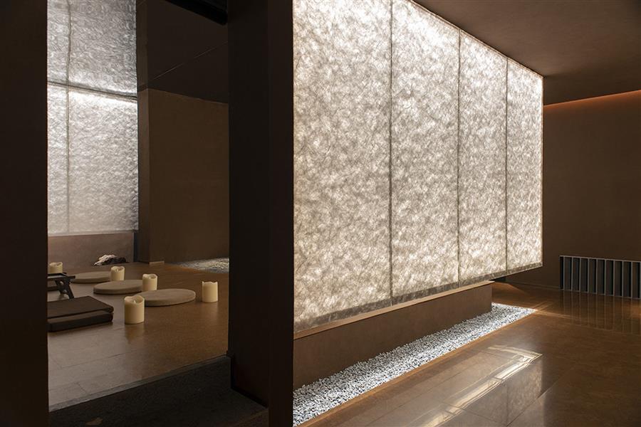 杜邦紙燈箱貫穿于核心空間、衛(wèi)生間及冥想空間等重要空間節(jié)點,以柔和、勻質(zhì)的光線模糊邊界,營造出靜謐而神圣的光影氛圍。