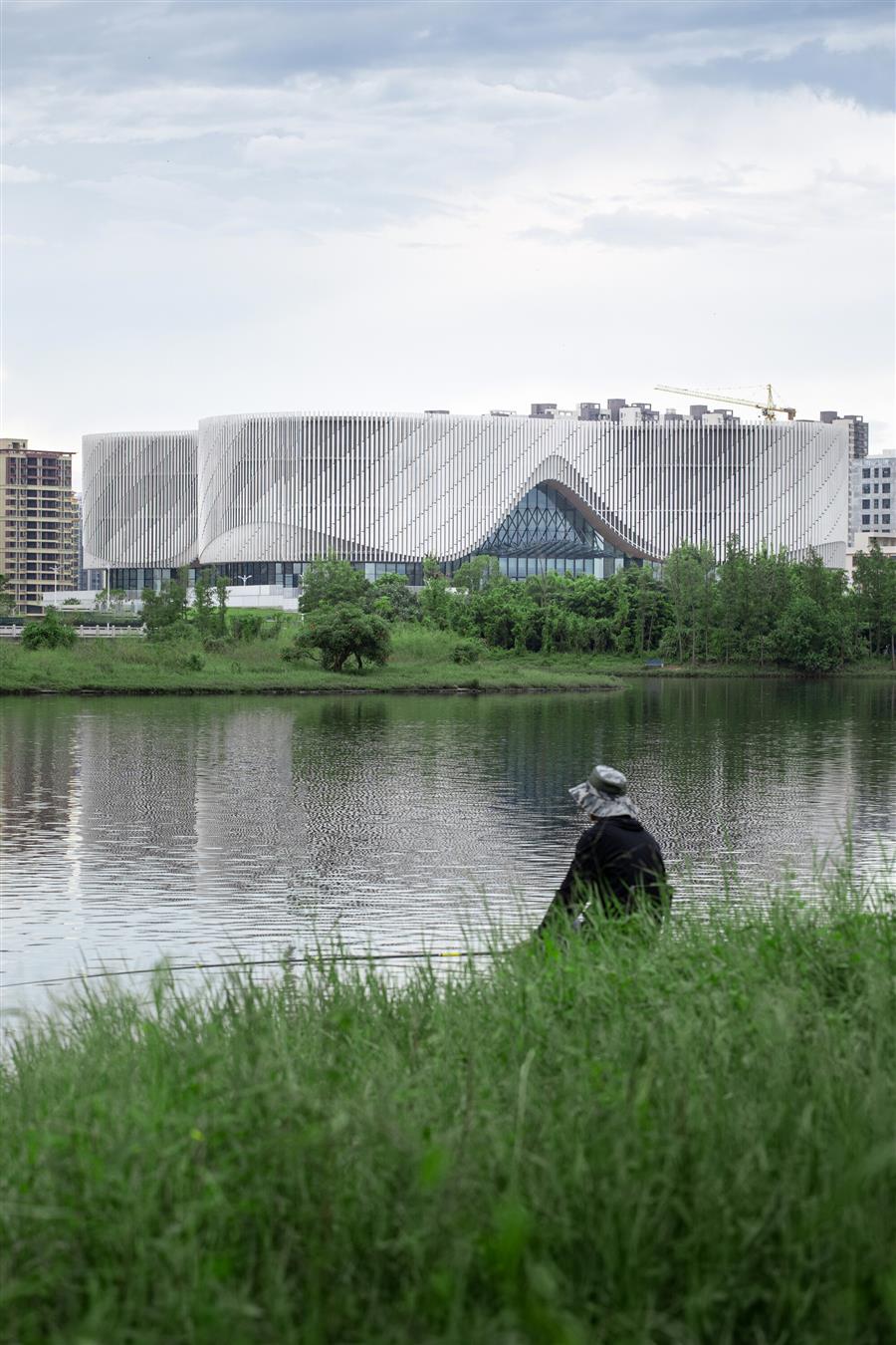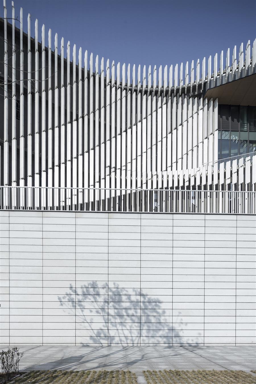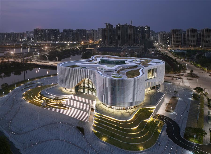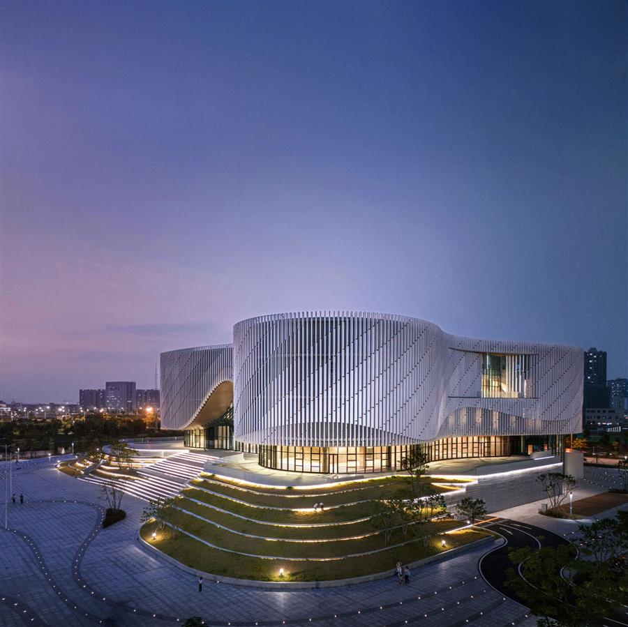 The subtle planar shape and contour control of the facade of the cultural center allow users to experience different shapes with different orientations and undulating contours as they walk around the building. The parameterized facade pottery rod texture can bring rich and dynamic light and shadow changes under the sunlight, which looks like sails and waves blowing in the breeze from a distance, demonstrating the regional characteristics and cultural self-confidence of Yangjiang as a coastal city.