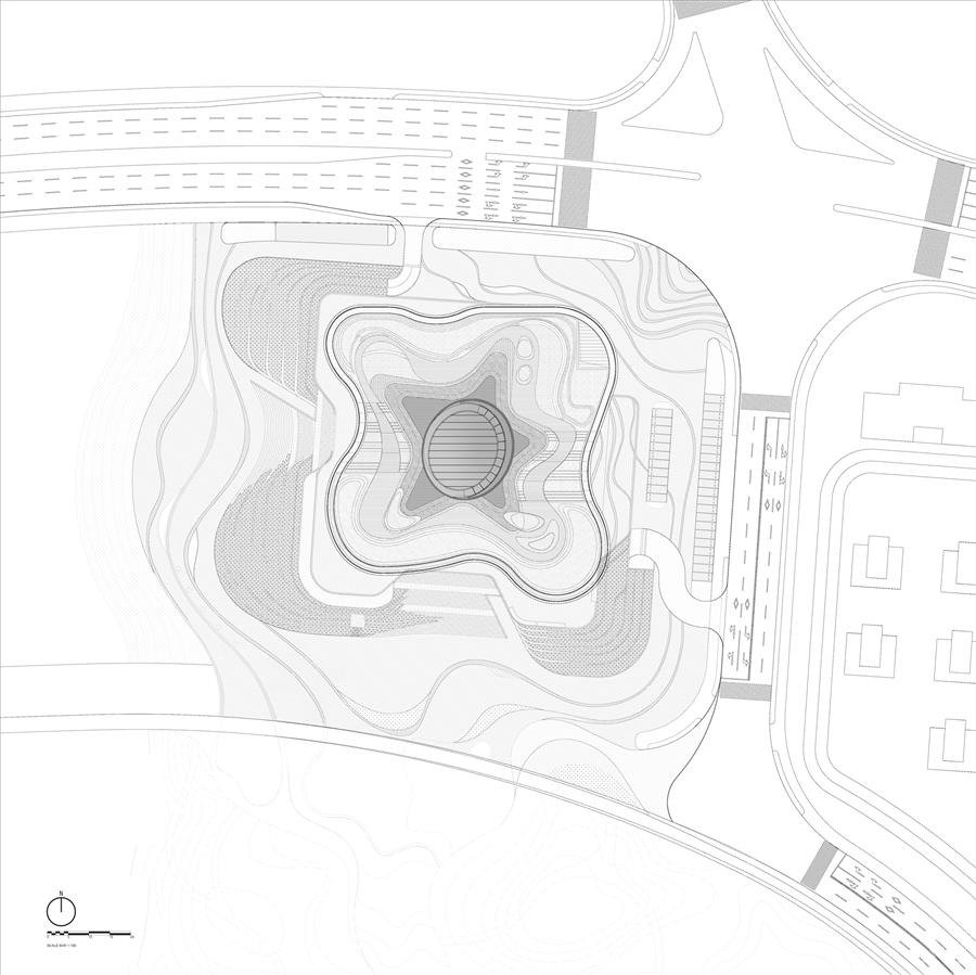 2.激發(fā)社區(qū)活力的開放平臺——我們希望文化中心不僅被設(shè)計為新區(qū)的地標,也能成為與周邊公園共享、為市民提供多重體驗活力場所。建筑基座通過綠化平臺的手法向漠陽湖公園延展打開,平臺上設(shè)置尺度宜人的平緩草坡,建筑基座部分融合如咖啡、書吧、工人文體活動等功能。市民可以隨意進入、停留、休息,結(jié)合平臺上的觀賞植物與條石座階的設(shè)計,市民不但可遠觀漠陽湖景和河流景色的全景視野,也可在平臺上實現(xiàn)各種社交活動,各得其所又不干擾。綠化平臺承載多樣活動,成為漠陽湖公園的一部分,將文化中心和公園的人與活動連為一體,使建筑從封閉的傳統(tǒng)文化公共建筑變成平時向社區(qū)開放的活動場所,激發(fā)新城區(qū)的社區(qū)活力。