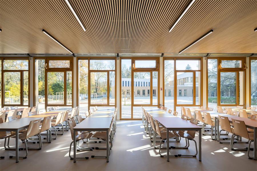 學校采用面向尼斯公園樹木繁茂區(qū)域的u形設計,圍繞其廣泛的景觀庭院進行組織。上部樓層采用木結構,以大面積的玻璃表面為特色,可以看到周圍的林地。這個外殼由木質框架墻和生物基絕緣材料制成,配有電動遮陽篷,以提供太陽保護。