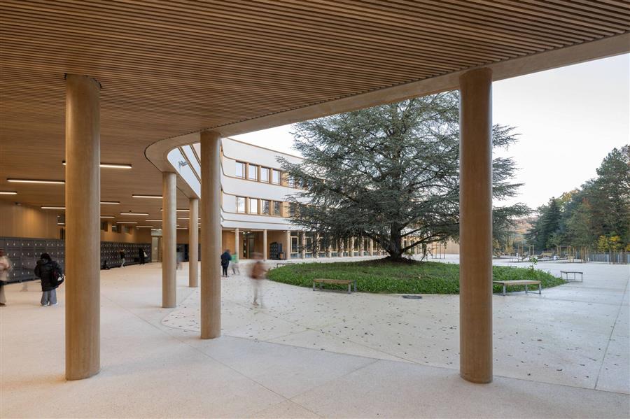 Six distinctive spaces are thus created: the "forest forecourt," which leads to the school through the classified woodland; the "grass-covered hill," interspersed with pathways and benches; the majestic cedar tree, preserved at the heart of the project and encircled by a unifying ring; the "suspended clearing," a peaceful area for quiet activities; the "science garden," a true educational tool; and finally, the residential garden, designed as a series of natural "micro-reserves."