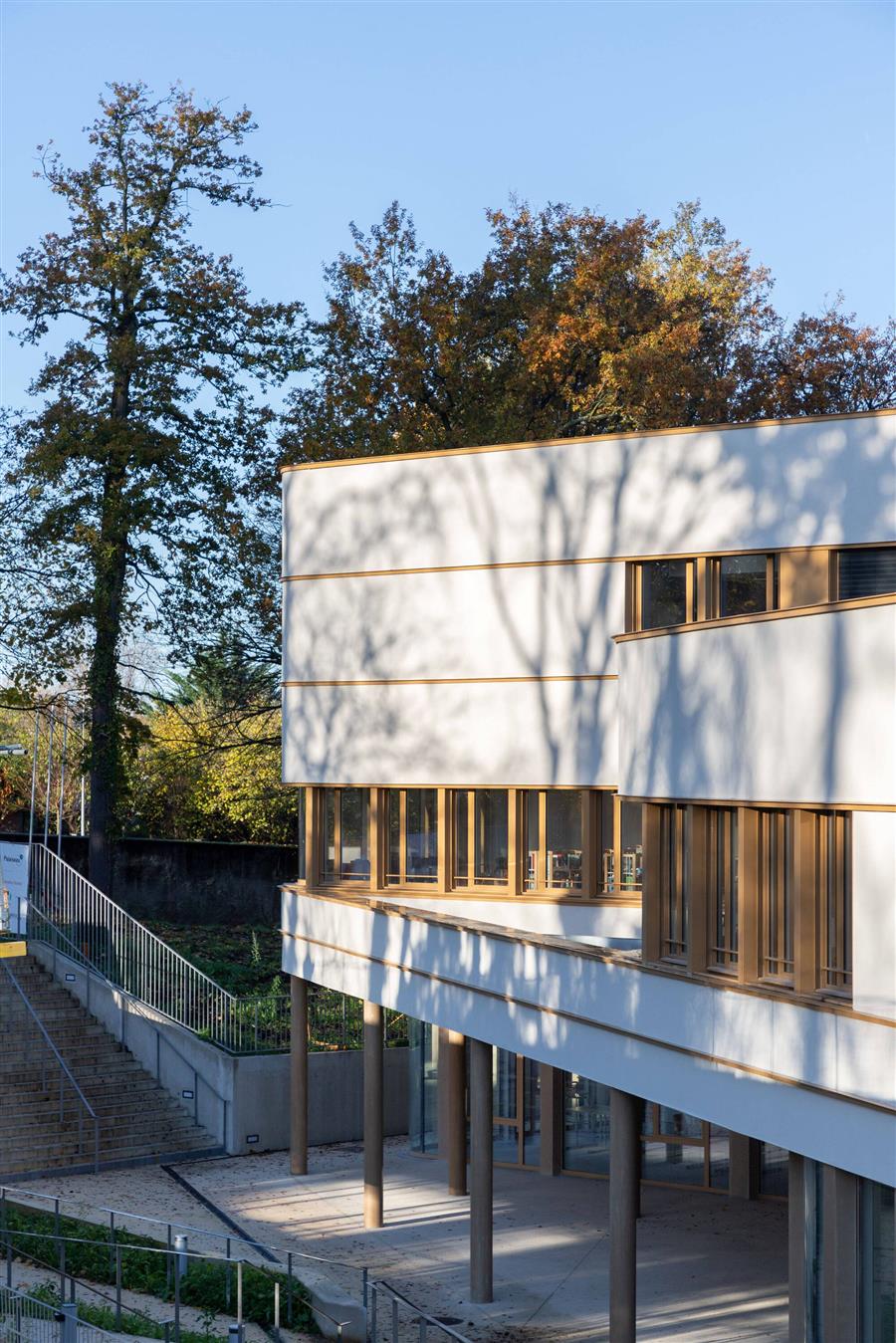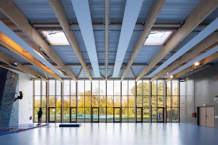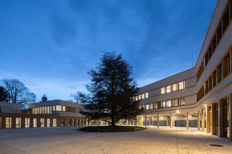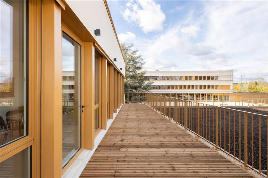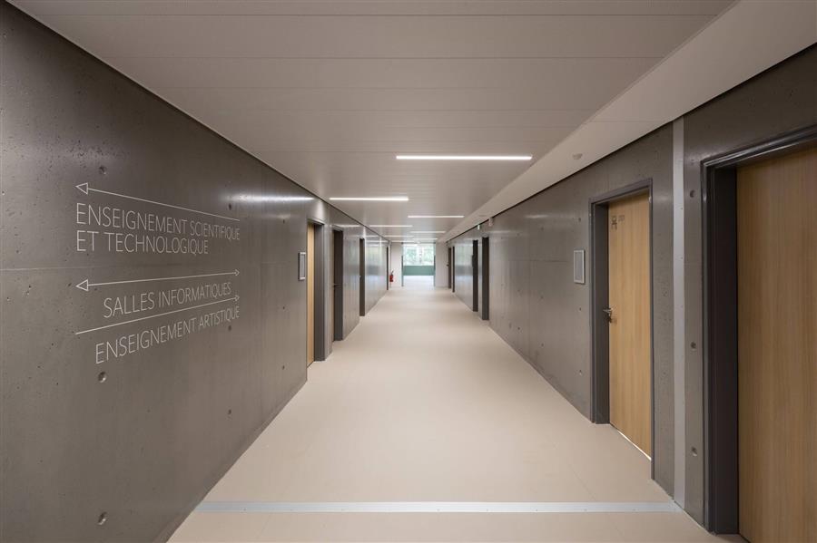 Adopting a U-shaped design oriented towards the wooded area of the Vilgénis park, the secondary school is organised around its extensively landscaped courtyard. Resting on a protective base of patterned, stained concrete, the upper floors, built with a wooden structure, feature large glazed surfaces that open up views towards the surrounding woodland. This envelope, made of timber-framed walls with bio-based insulation, is fitted with motorised sunshades to provide solar protection.
