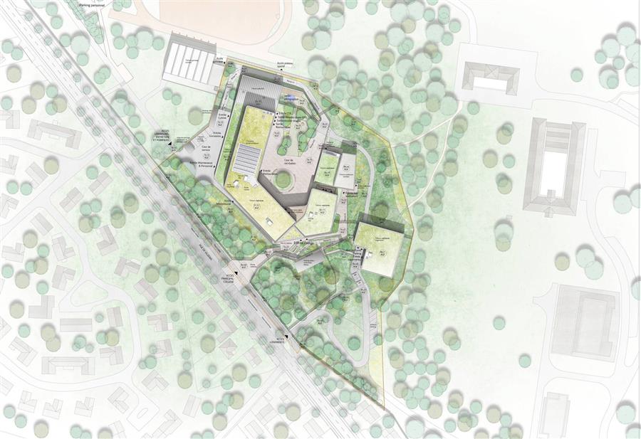 The new Massy secondary school is built on the Vilgénis site, formerly the Air France Aviation Apprenticeship Training Center. This 22-hectare site, with its exceptional woodland character, partially listed, provides the school with a green setting in which this major facility must blend as harmoniously as possible. With a strong commitment to maximising the preservation of these landscaped areas, the project adopts a highly compact form. The building follows the natural slope of the land to avoid the excessive spread of this large-scale programme.